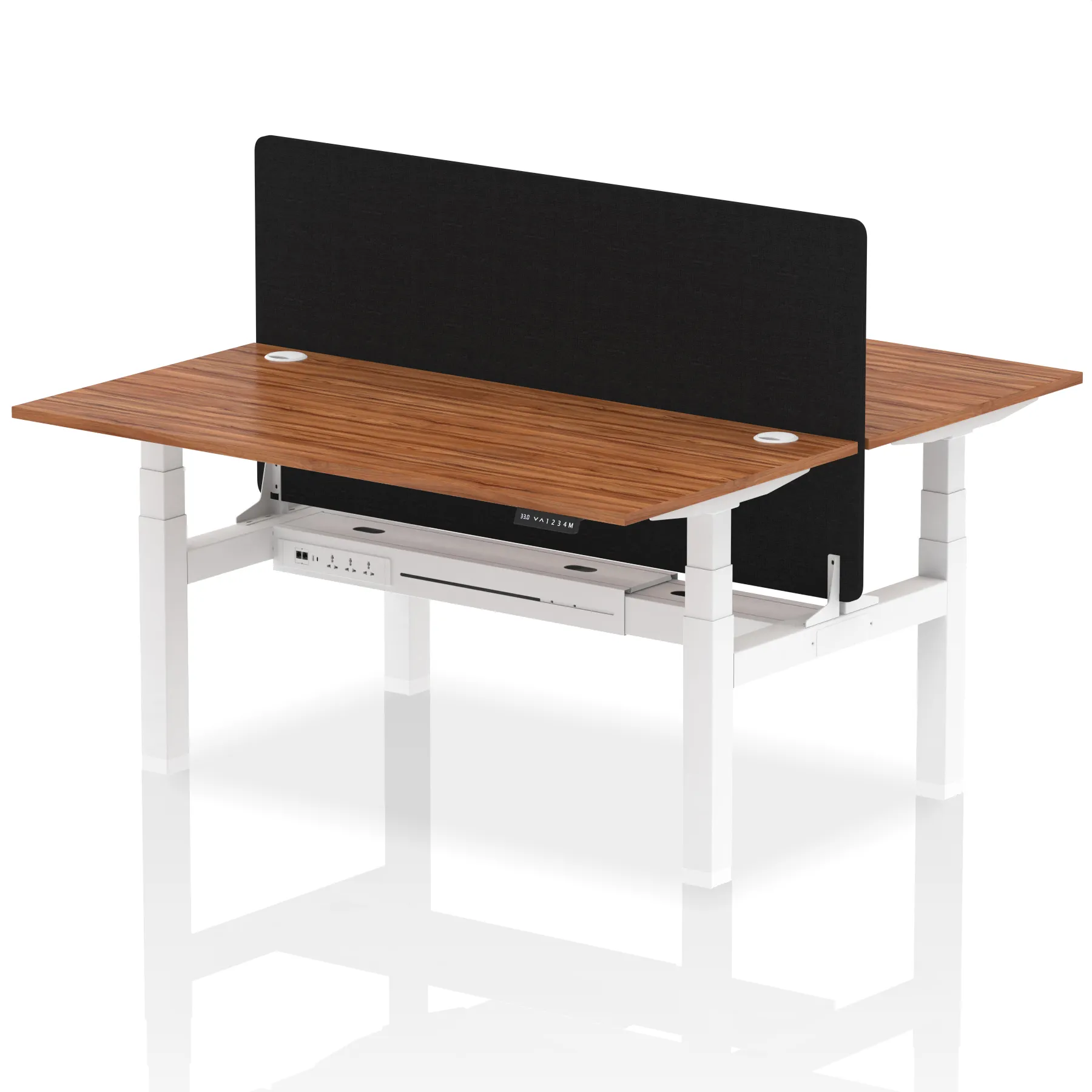 Elevate your office with the Air Back-to-Back Height Adjustable Desk for two, a blend of ergonomics and connectivity. Each desk includes two Ethernet ports, a USB and USB-C port, and three UK plugs, complemented by integrated cable ports for a clean setup. The addition of a straight screen offers privacy and focus. This desk is a perfect match for professionals seeking a tidy, tech-friendly, and adaptable workspace.