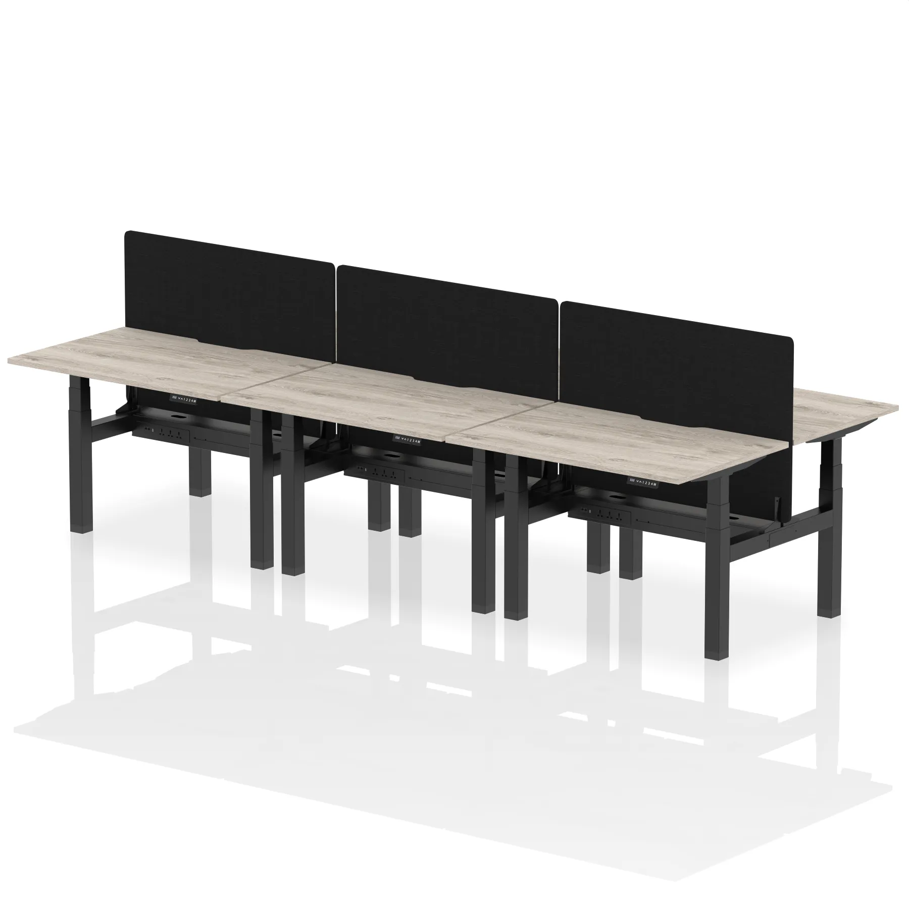Experience cutting-edge collaboration with the Air Back-to-Back Height Adjustable Desk for six, featuring a unique scalloped edge design and a dividing screen per duo. Each desk is outfitted with two Ethernet ports, a USB port, a USB-C port, and three UK plugs, ensuring unparalleled connectivity. The adjustable height caters to ergonomic needs, making it perfect for dynamic teams who prioritize both style and functionality in their workspace.