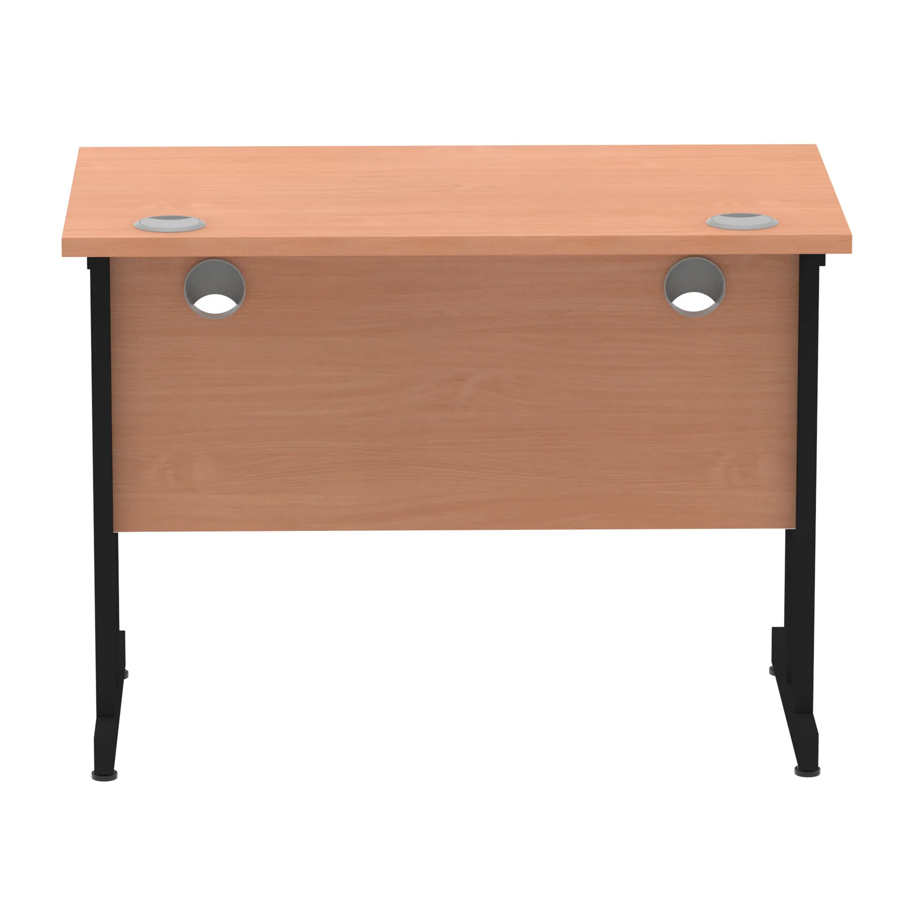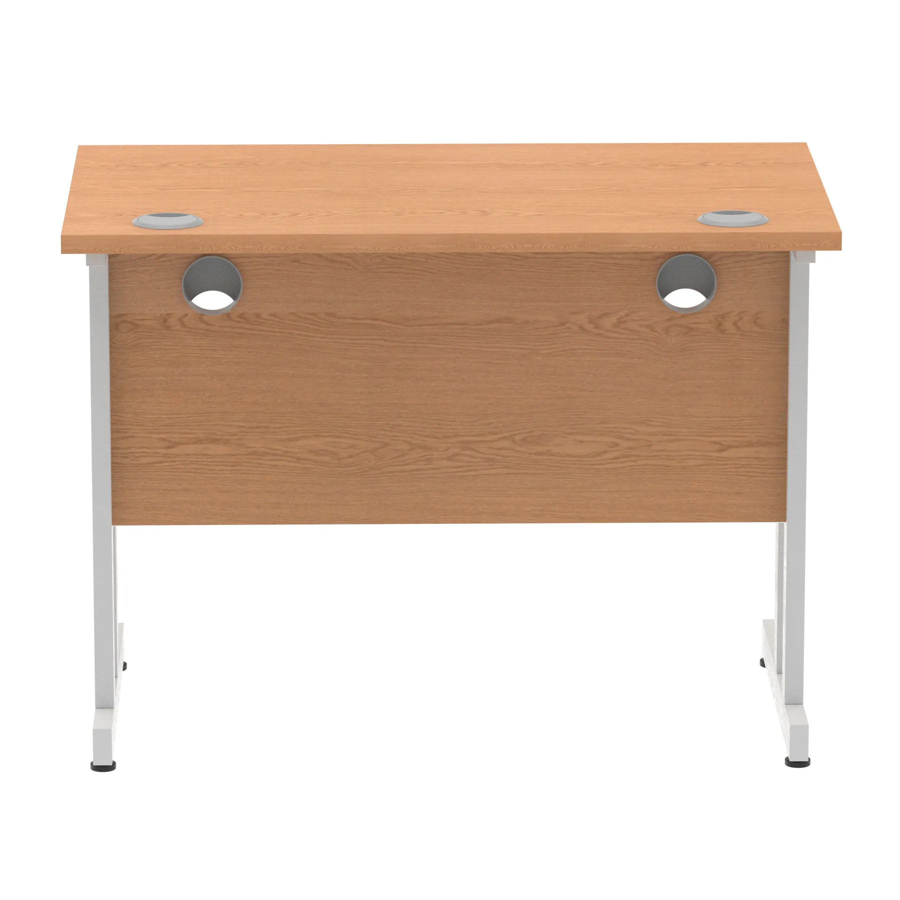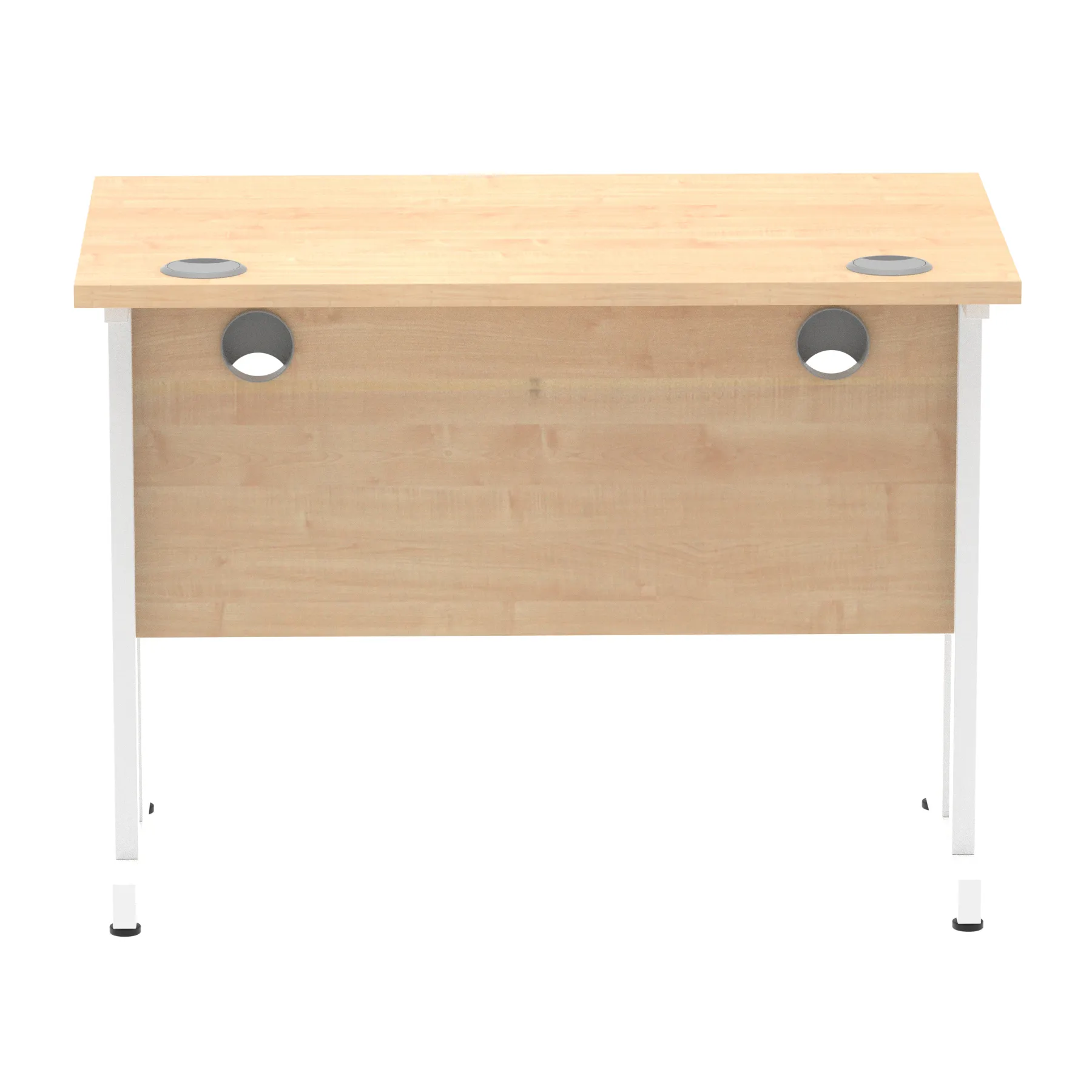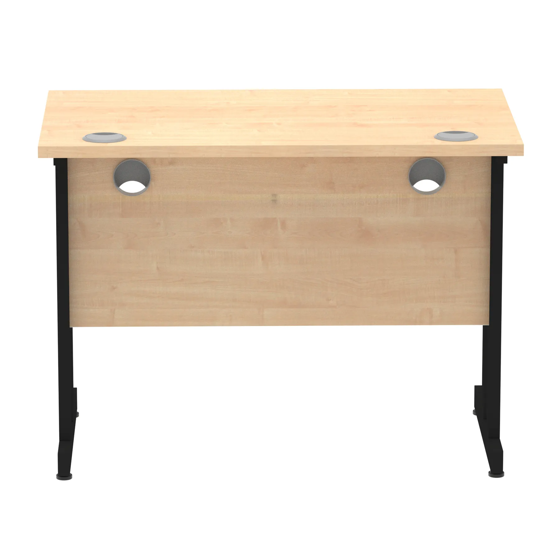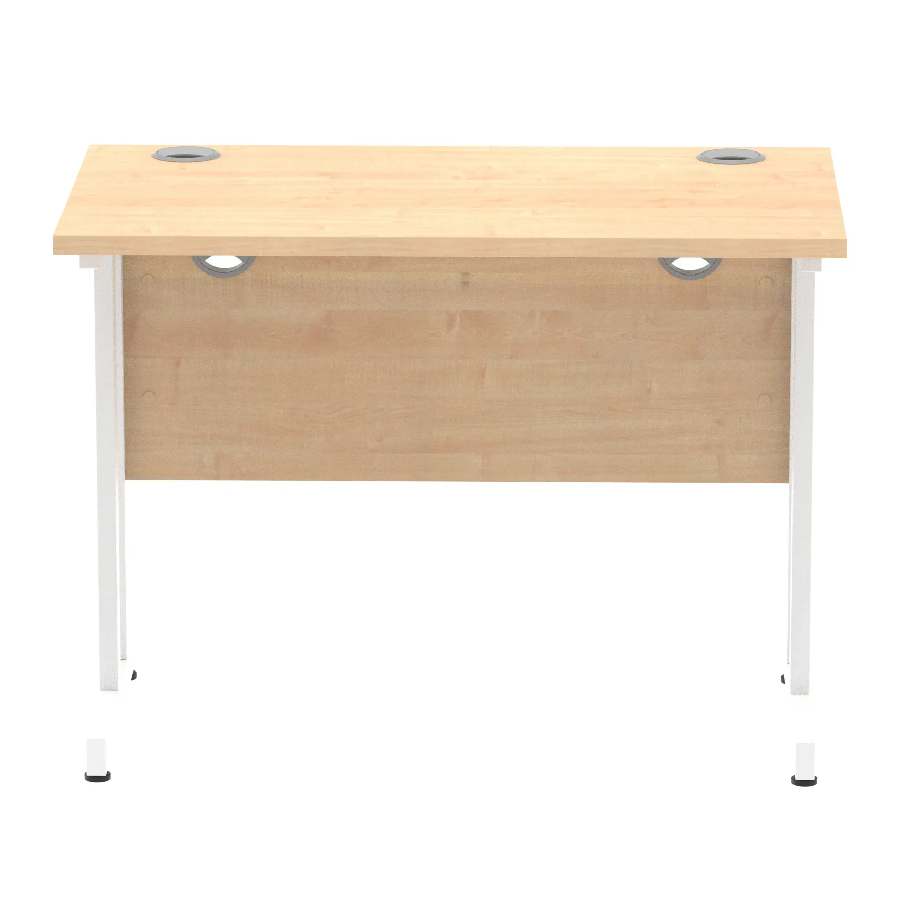 Impulse contract desk | 25mm tops | Heat resistant melamine finish | 18mm modesty panels | 2mm protective abs edging | Double strut legs | 2 cable ports | Height adjustable feet | Steel to steel fixings | 2 modesty panels slots| Deep set modesty panel (5″) allows for compatibility of most screen clamp fittings | Weight Capacity 135Kg