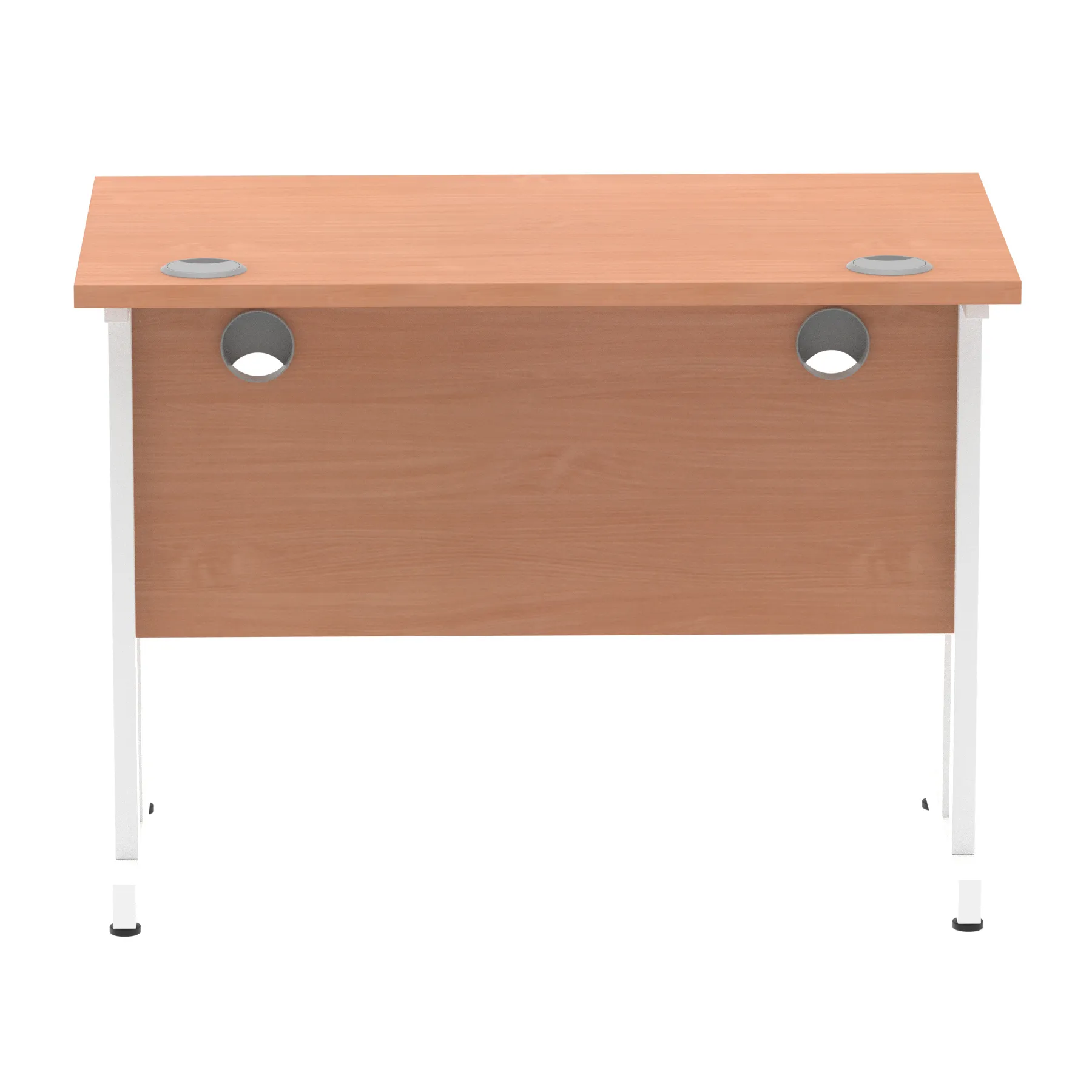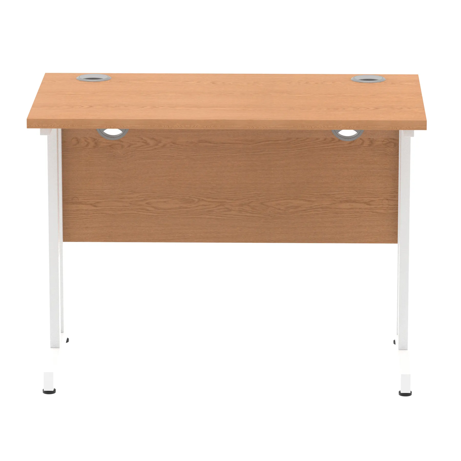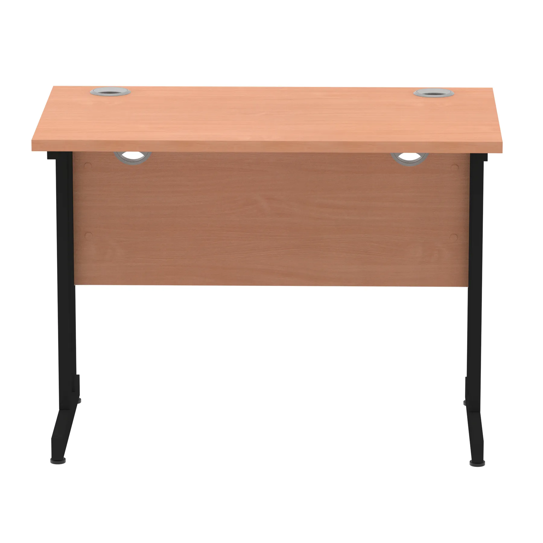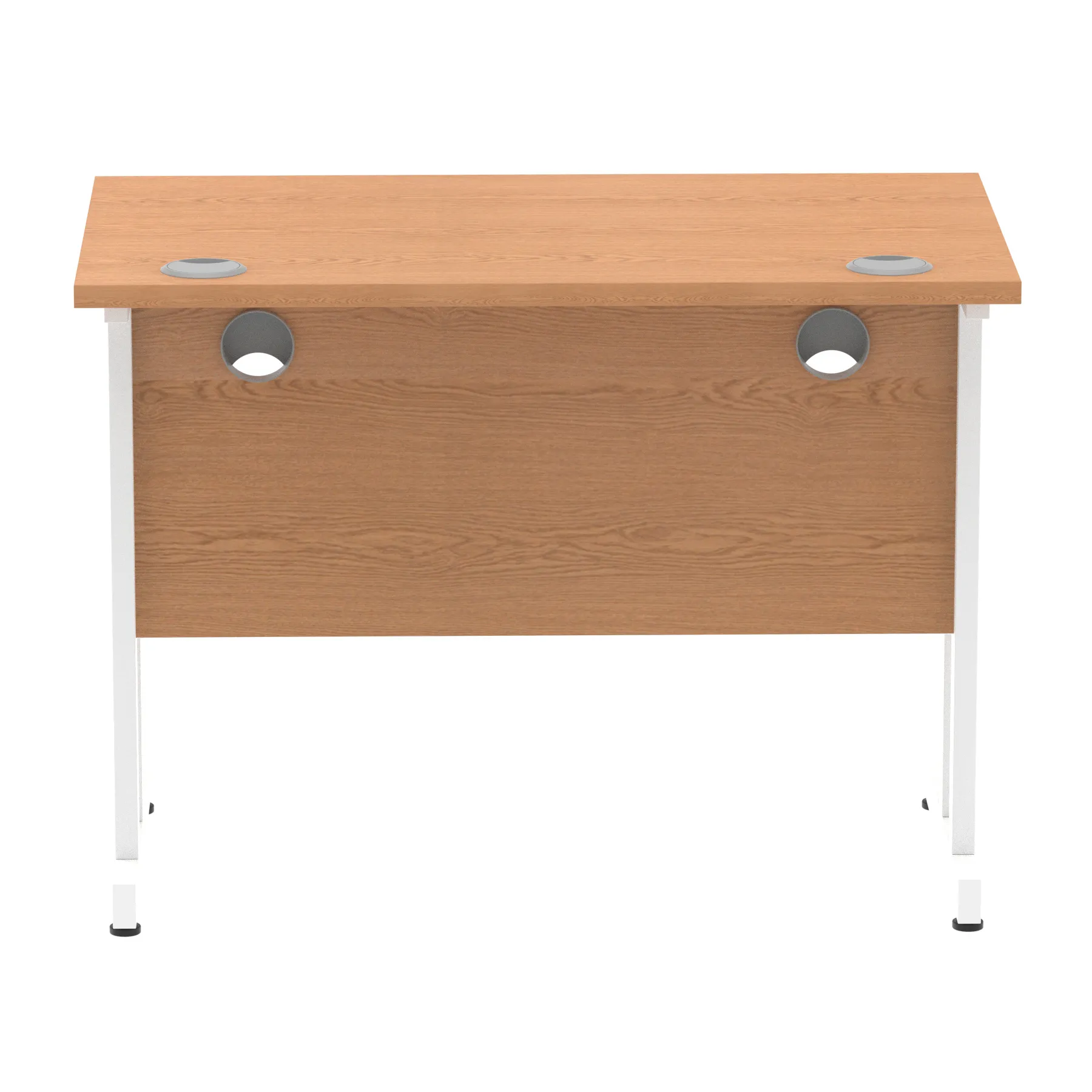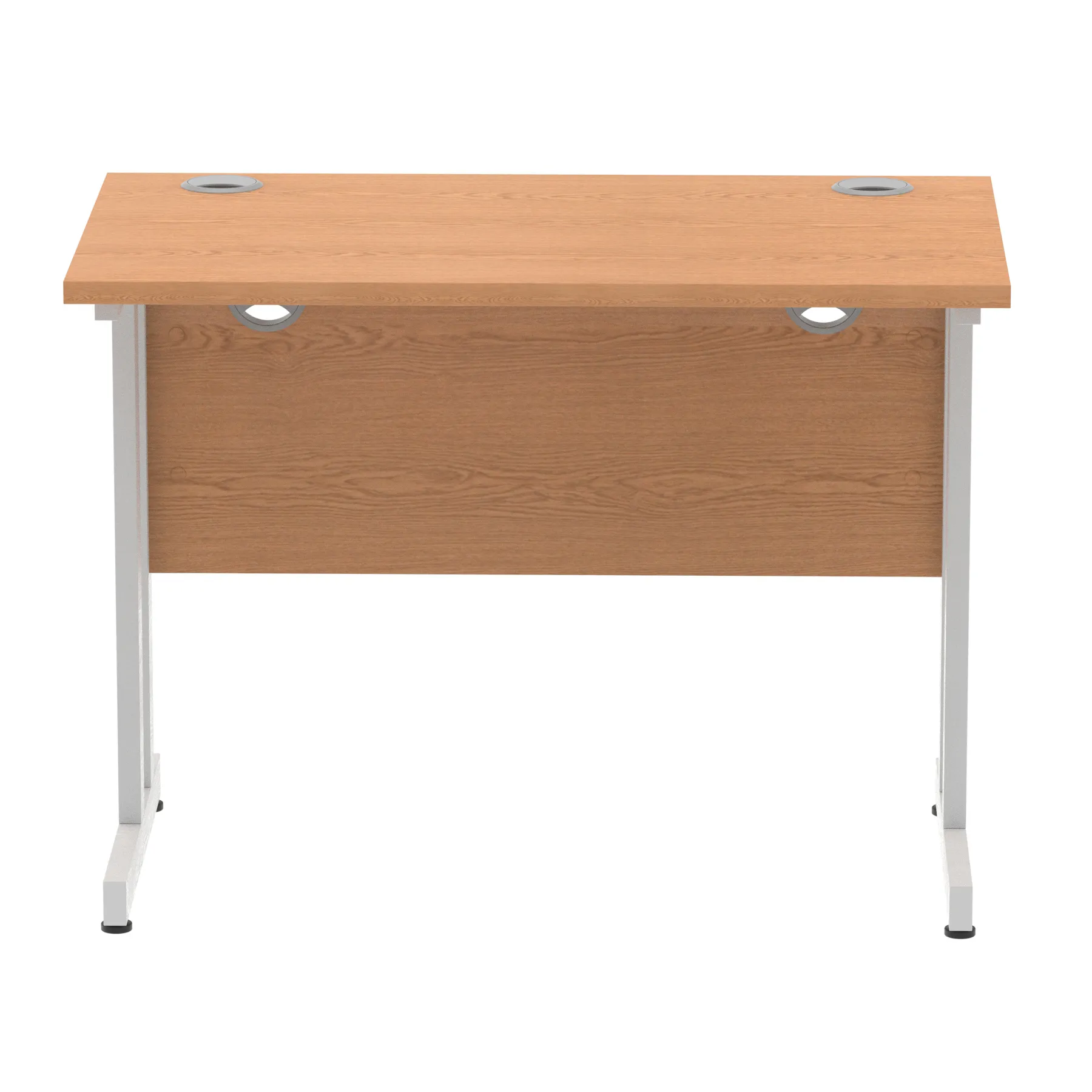 Impulse contract desk | 25mm tops | Heat resistant melamine finish | 18mm modesty panels | 2mm protective abs edging | Double strut legs | 2 cable ports | Height adjustable feet | Steel to steel fixings | 2 modesty panels slots| Deep set modesty panel (5″) allows for compatibility of most screen clamp fittings | Weight Capacity 135Kg