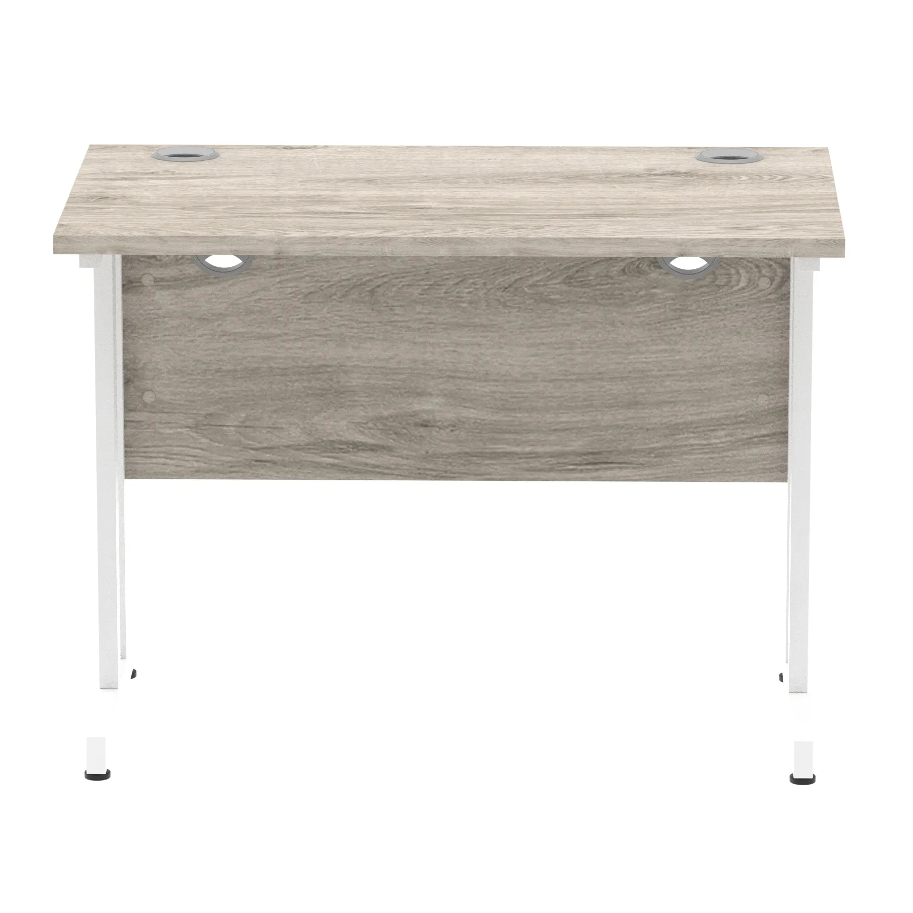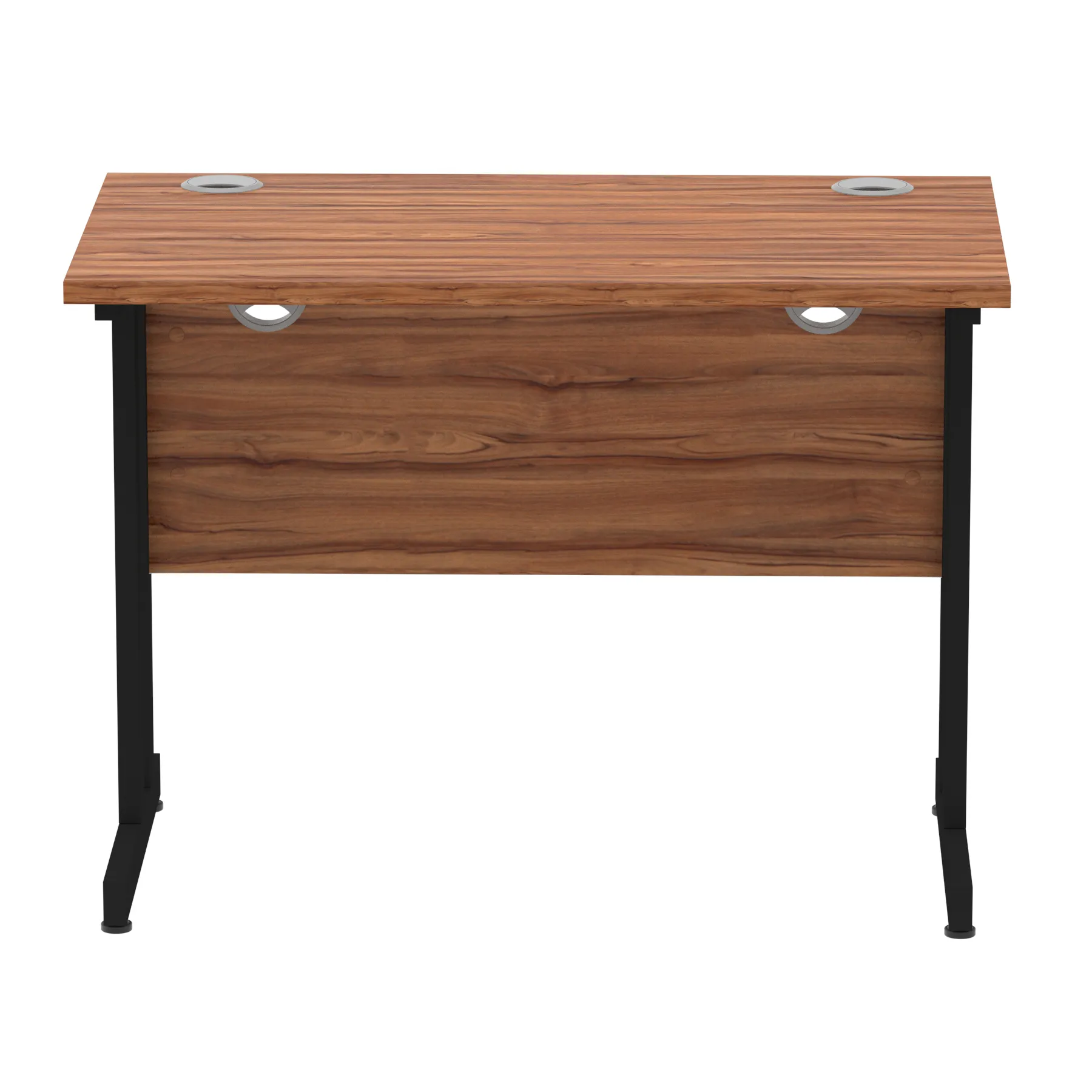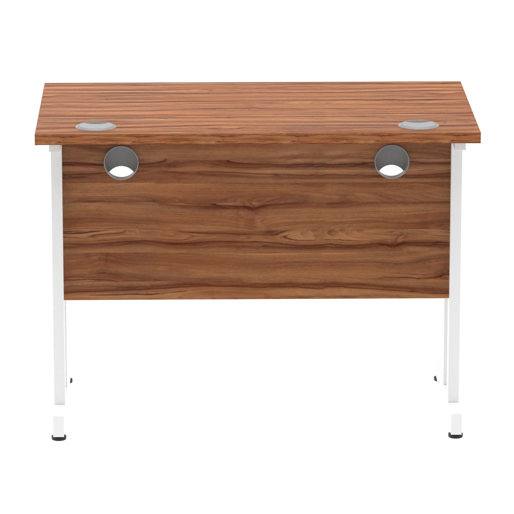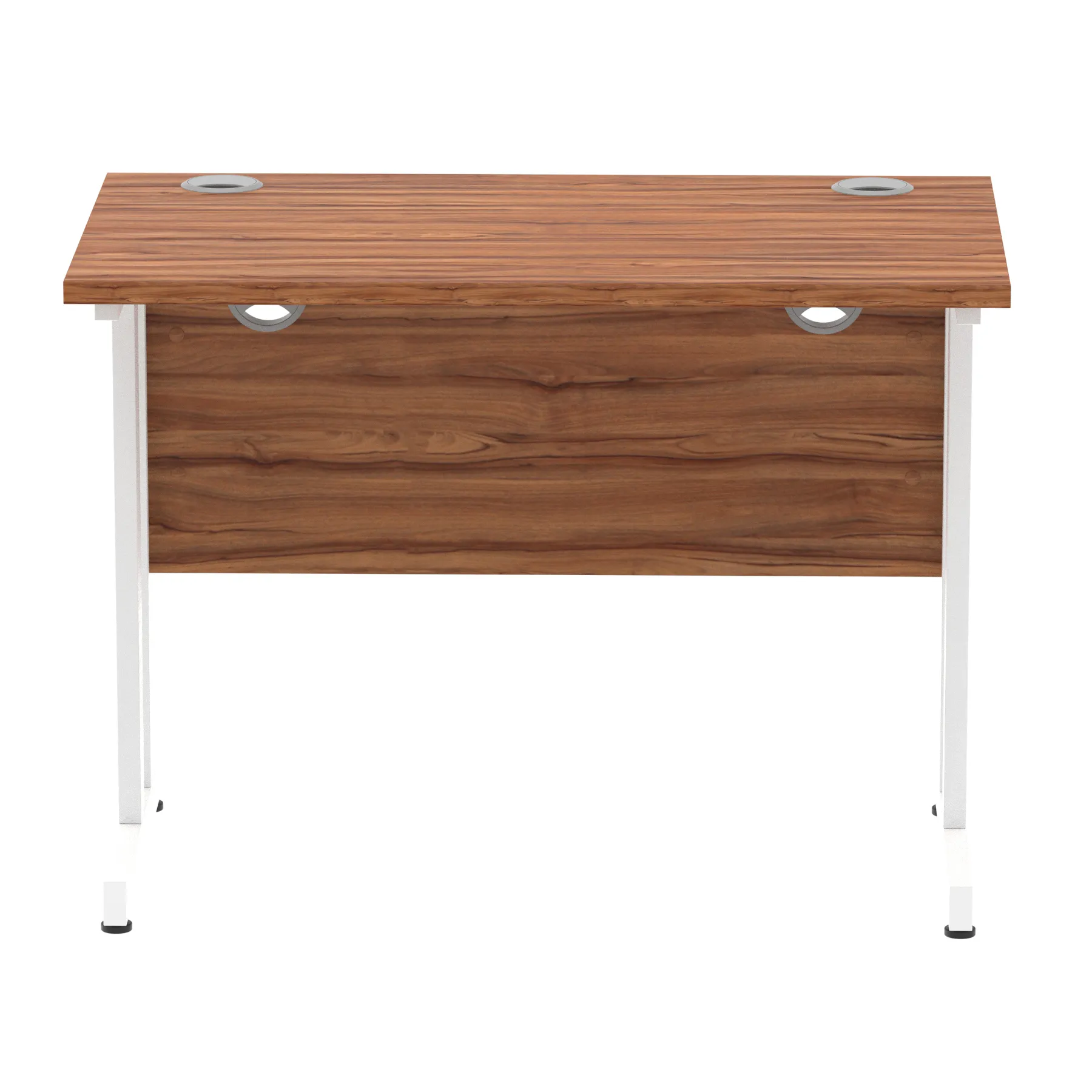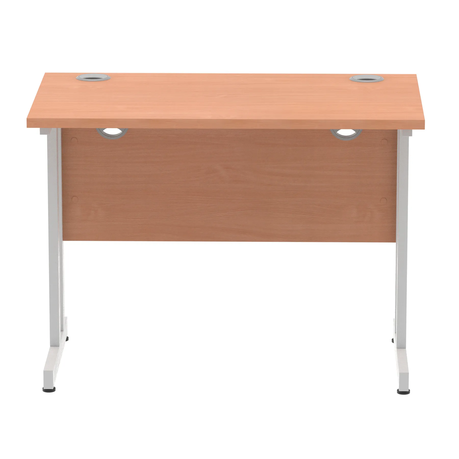 Impulse contract desk | 25mm tops | Heat resistant melamine finish | 18mm modesty panels | 2mm protective abs edging | Double strut legs | 2 cable ports | Height adjustable feet | Steel to steel fixings | 2 modesty panels slots| Deep set modesty panel (5″) allows for compatibility of most screen clamp fittings | Weight Capacity 135Kg