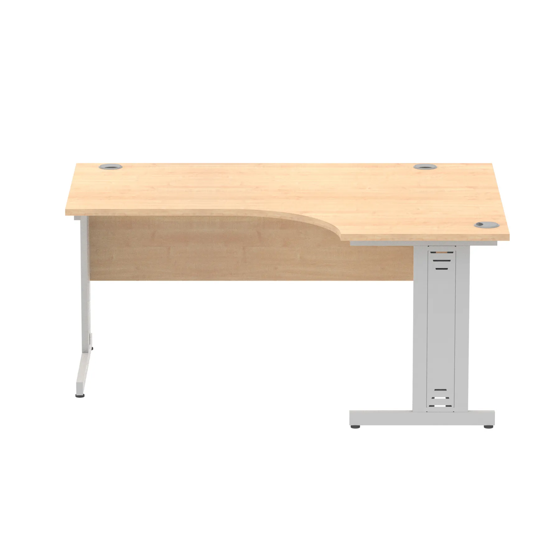 • Impulse contract 1600 wide crescent desk • 25mm tops • Heat resistant melamine finish • 18mm modesty panels • 2mm protective abs edging • Double strut legs • 3 cable ports • Height adjustable feet • Steel to steel fixings • 3 modesty panels slots • 600 deep • Deep set modesty panel (5″) allows for compatibility of most screen clamp fittings • Weight Capacity: 135Kg