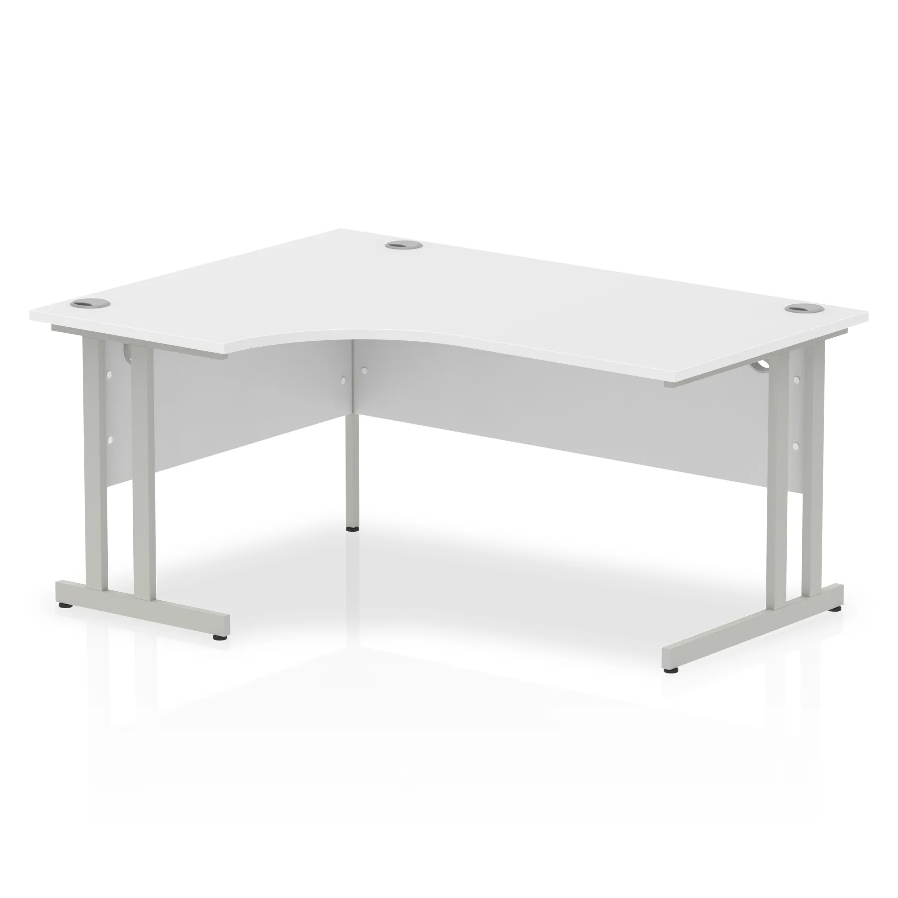 Impulse contract 1600 wide crescent desk | 25mm tops | Heat resistant beech melamine finish | 18mm modesty panels | 2mm protective abs edging | Silver coated double strut legs | 3 cable ports | Height adjustable feet | Steel to steel fixings | 3 modesty panels slots | 600 deep | Deep set modesty panel (5″) allows for compatibility of most screen clamp fittings | Weight Capacity 135Kg