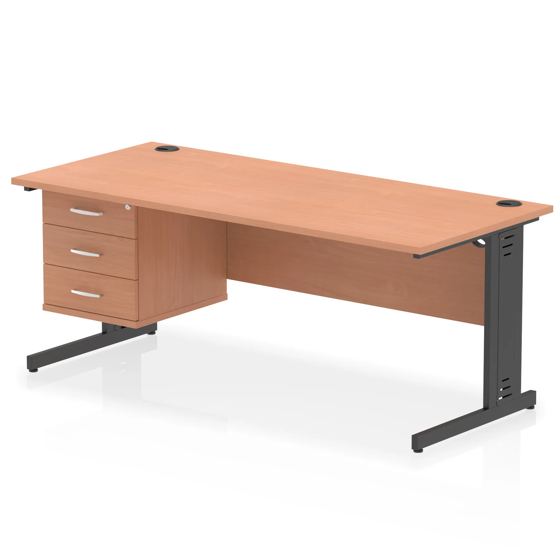 • Impulse contract 1800 wide desk • 25mm tops • Wire management panel • Heat resistant beech melamine finish • 18mm modesty panel • 2mm protective abs edging • Silver coated double strut legs • 2 cable ports • Height adjustable feet • Steel to steel fixings • 2 modesty panel slots • Deep set modesty panel (5”) allows for compatibility of most screen clamp fittings • Fixed pedestal