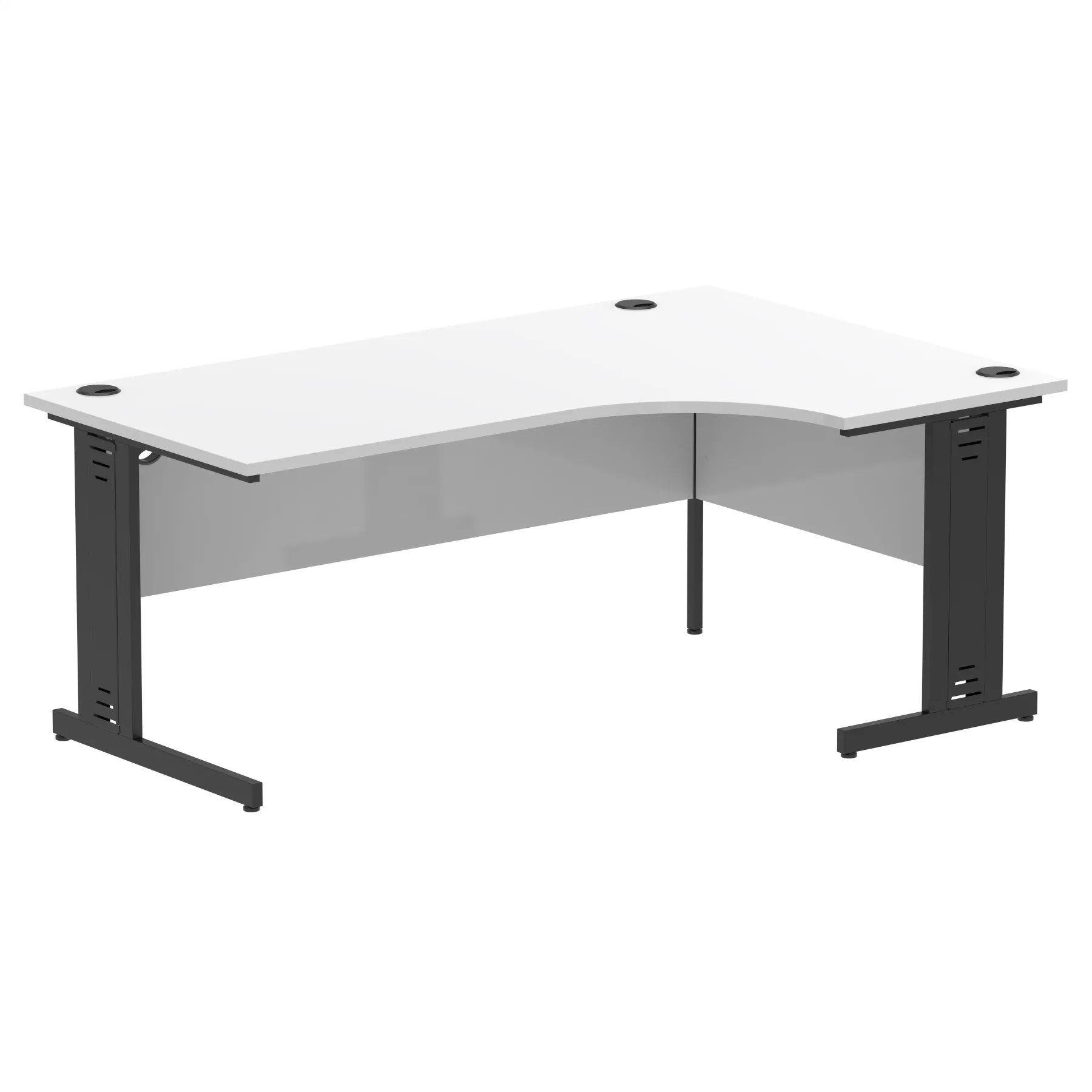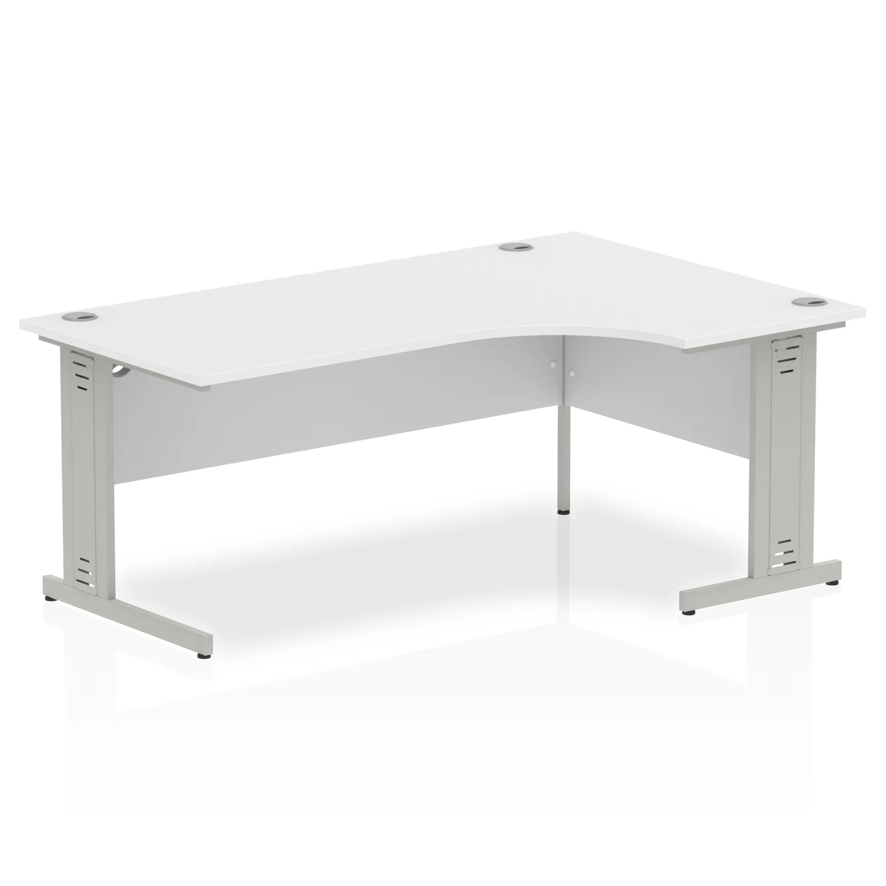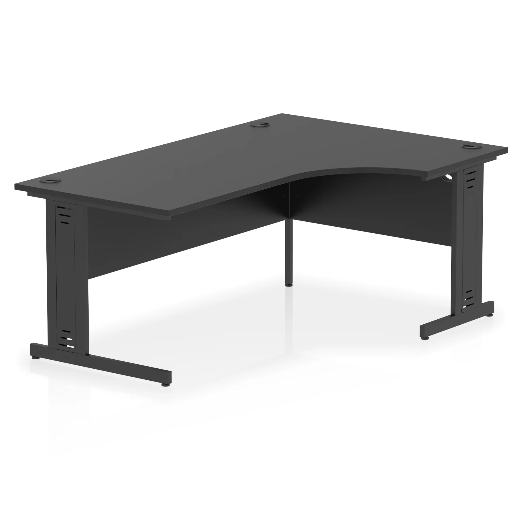 • Impulse contract 1800 wide crescent desk • 25mm tops • Heat resistant melamine finish • 18mm modesty panels • 2mm protective abs edging • Double strut legs • 3 cable ports • Height adjustable feet • Steel to steel fixings • 3 modesty panels slots • 600 deep • Deep set modesty panel (5″) allows for compatibility of most screen clamp fittings • Weight Capacity: 135Kg