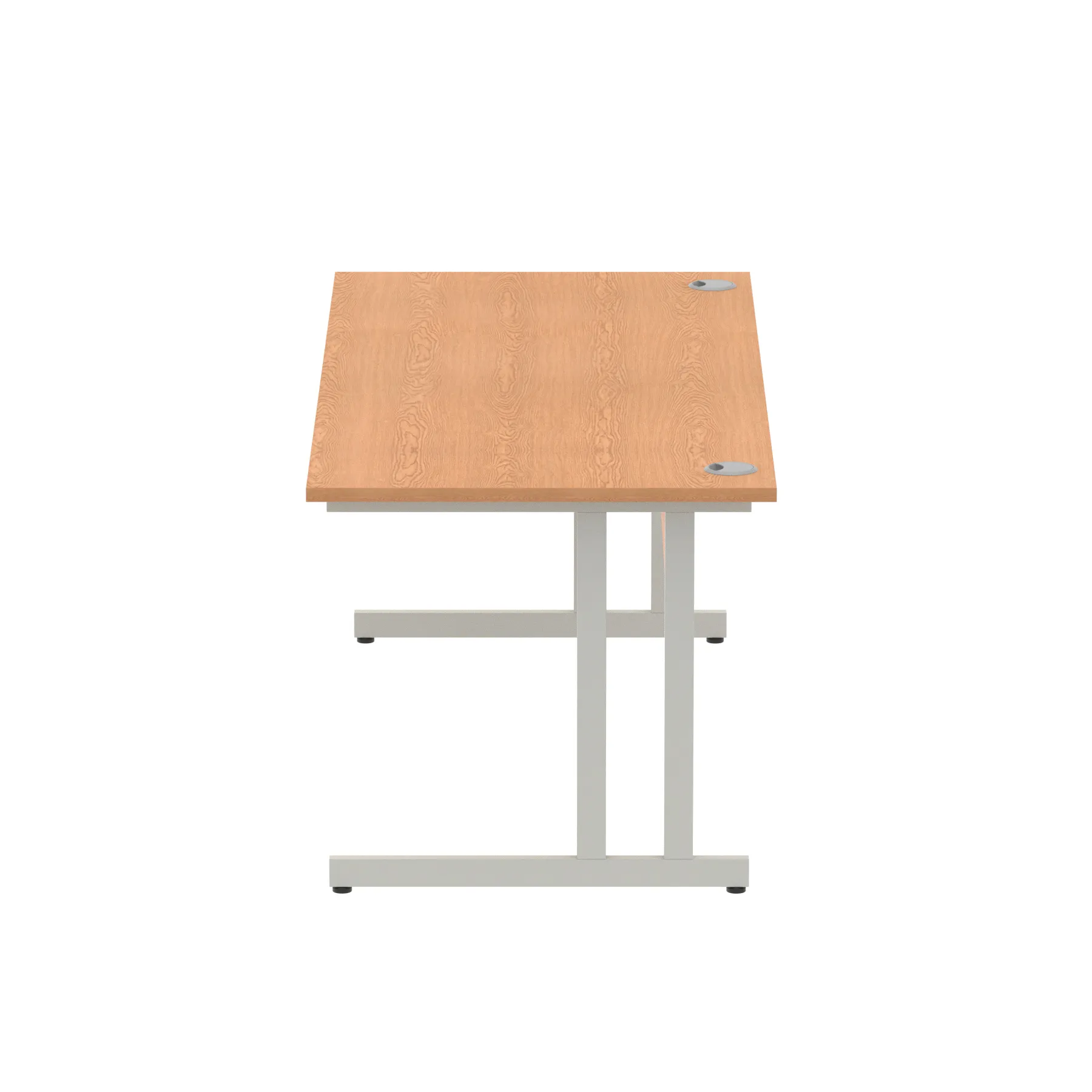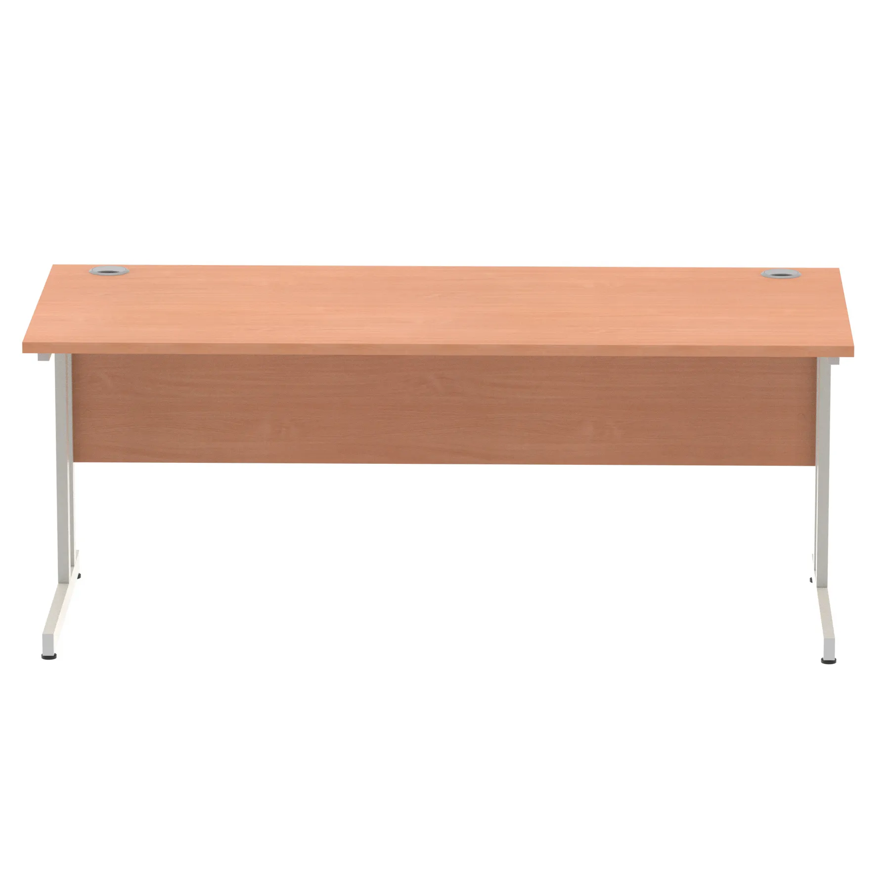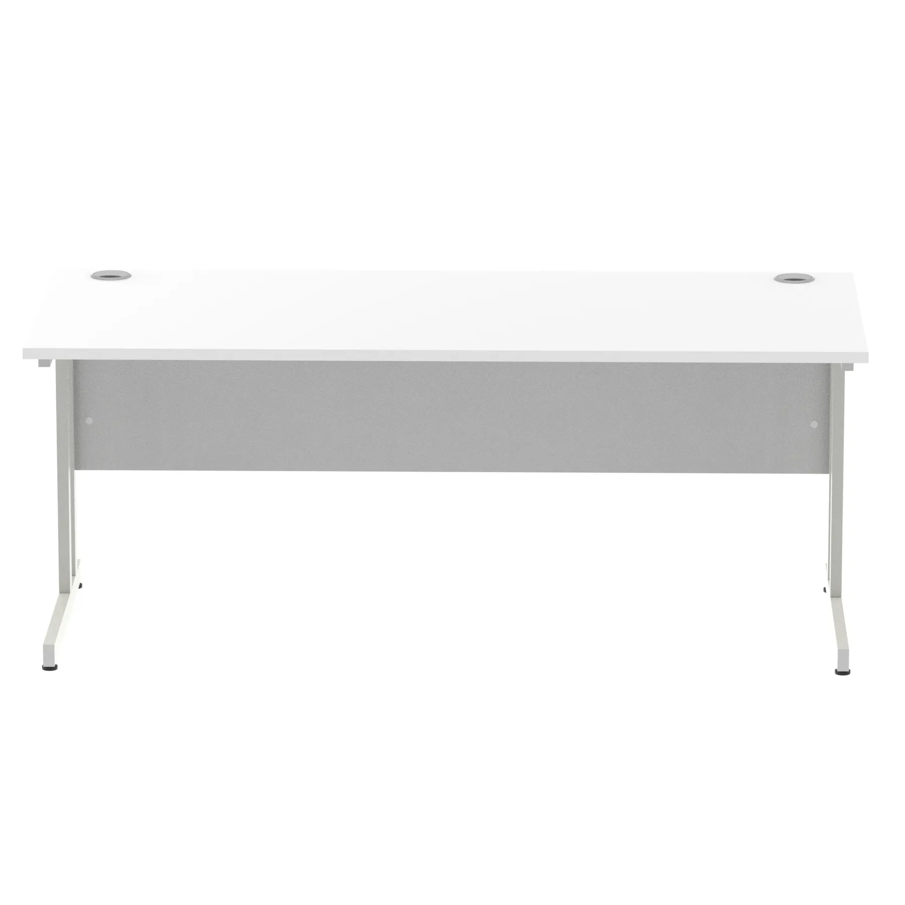Impulse contract desk | 25mm tops | Heat resistant melamine finish | 18mm modesty panels | 2mm protective abs edging | Double strut legs | 2 cable ports | Height adjustable feet | Steel to steel fixings | 2 modesty panels Ports| Deep set modesty panel (5″) allows for compatibility of most screen clamp fittings | Weight Capacity 135Kg