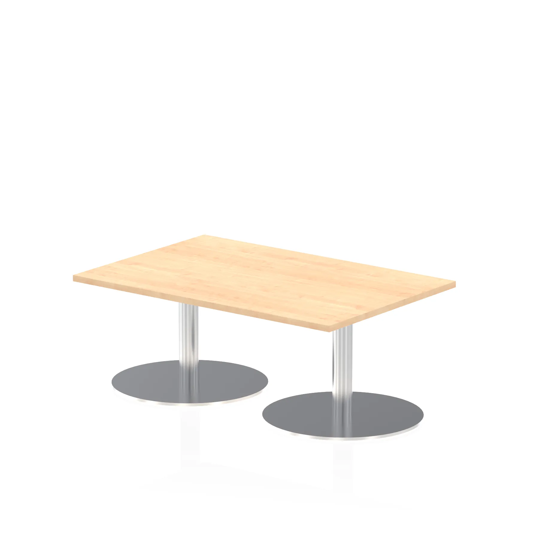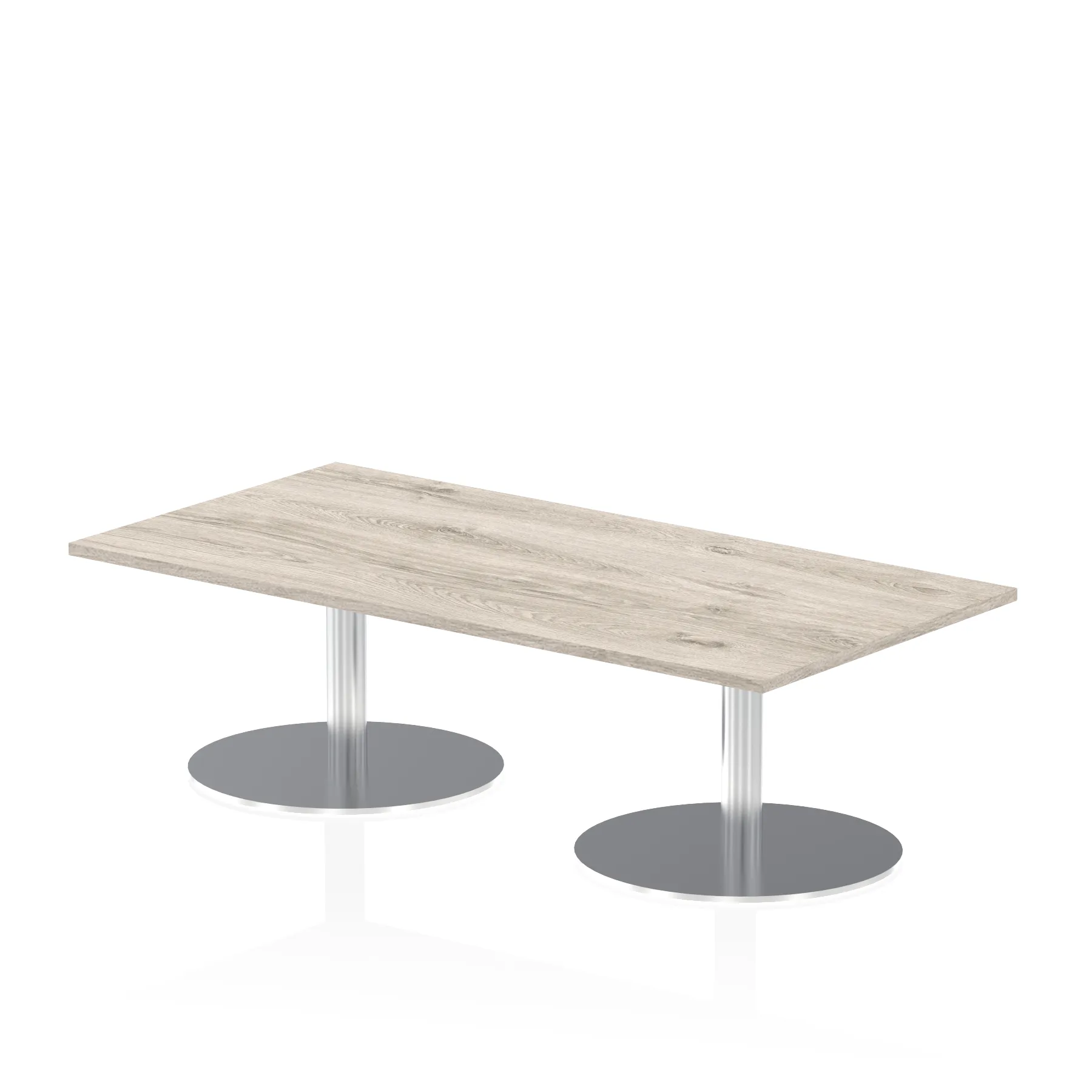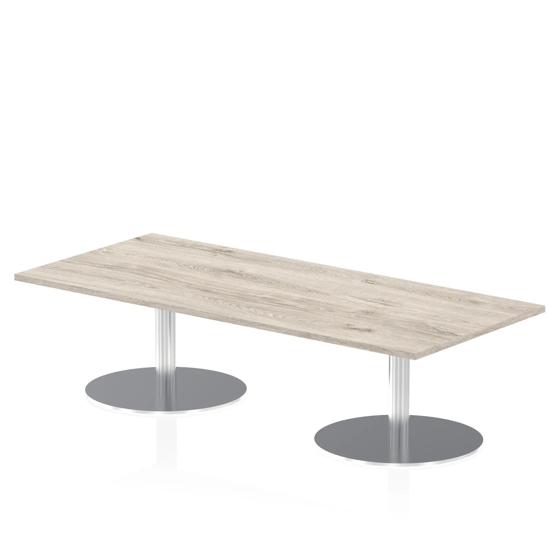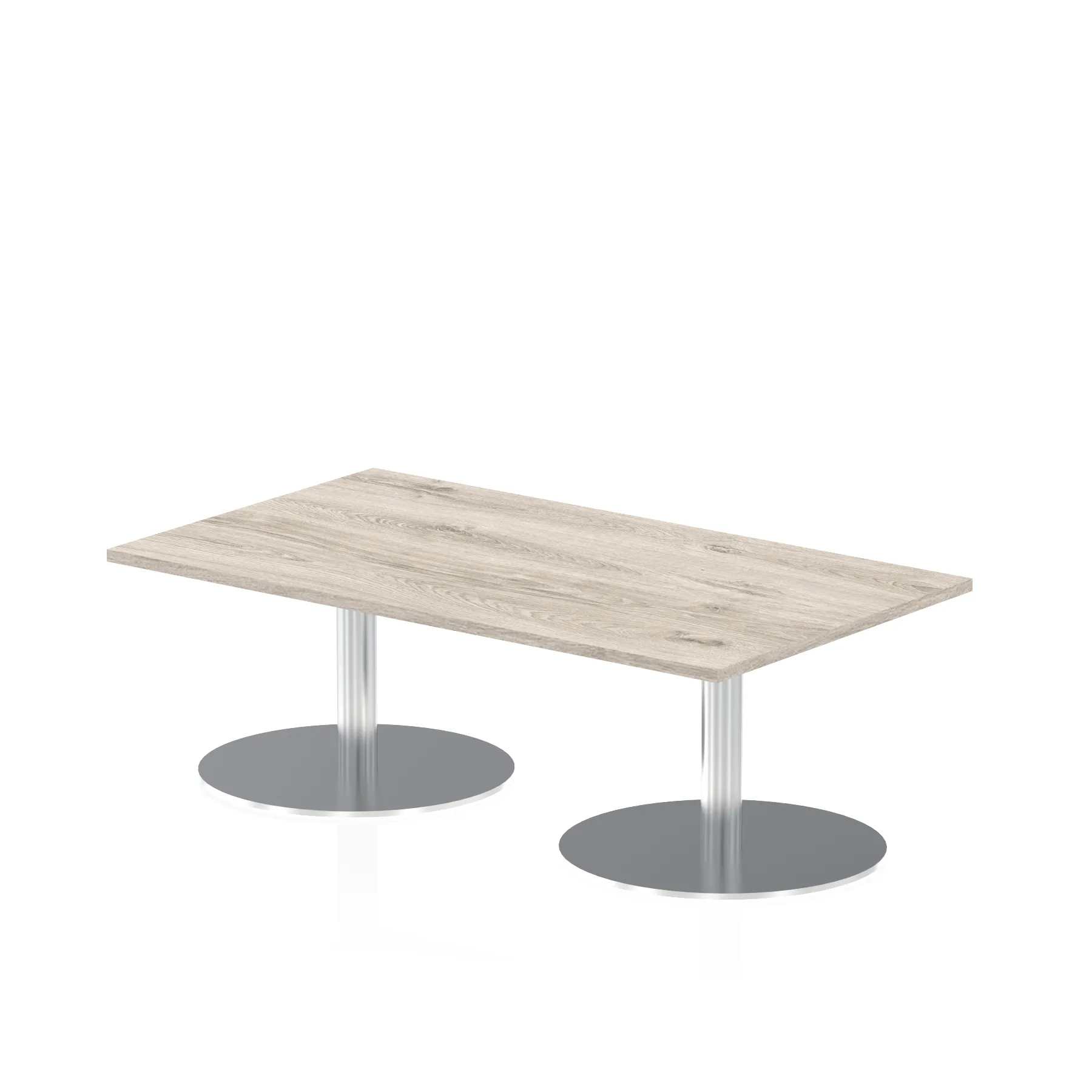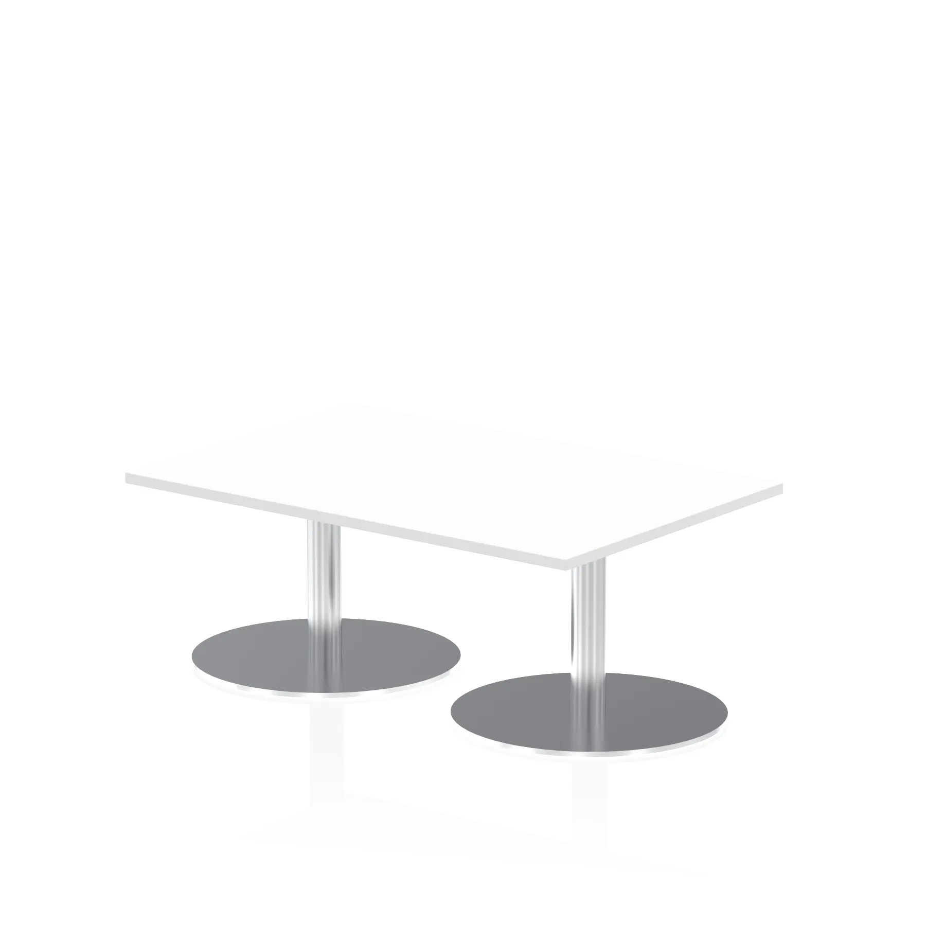 25mm thick desk top profile | Dual, brushed stainless steel effect circular base (580mm diameter) | Brushed stainless steel pillars (76mm diameter) | Weighted base provides stability | Two part bolted frame system