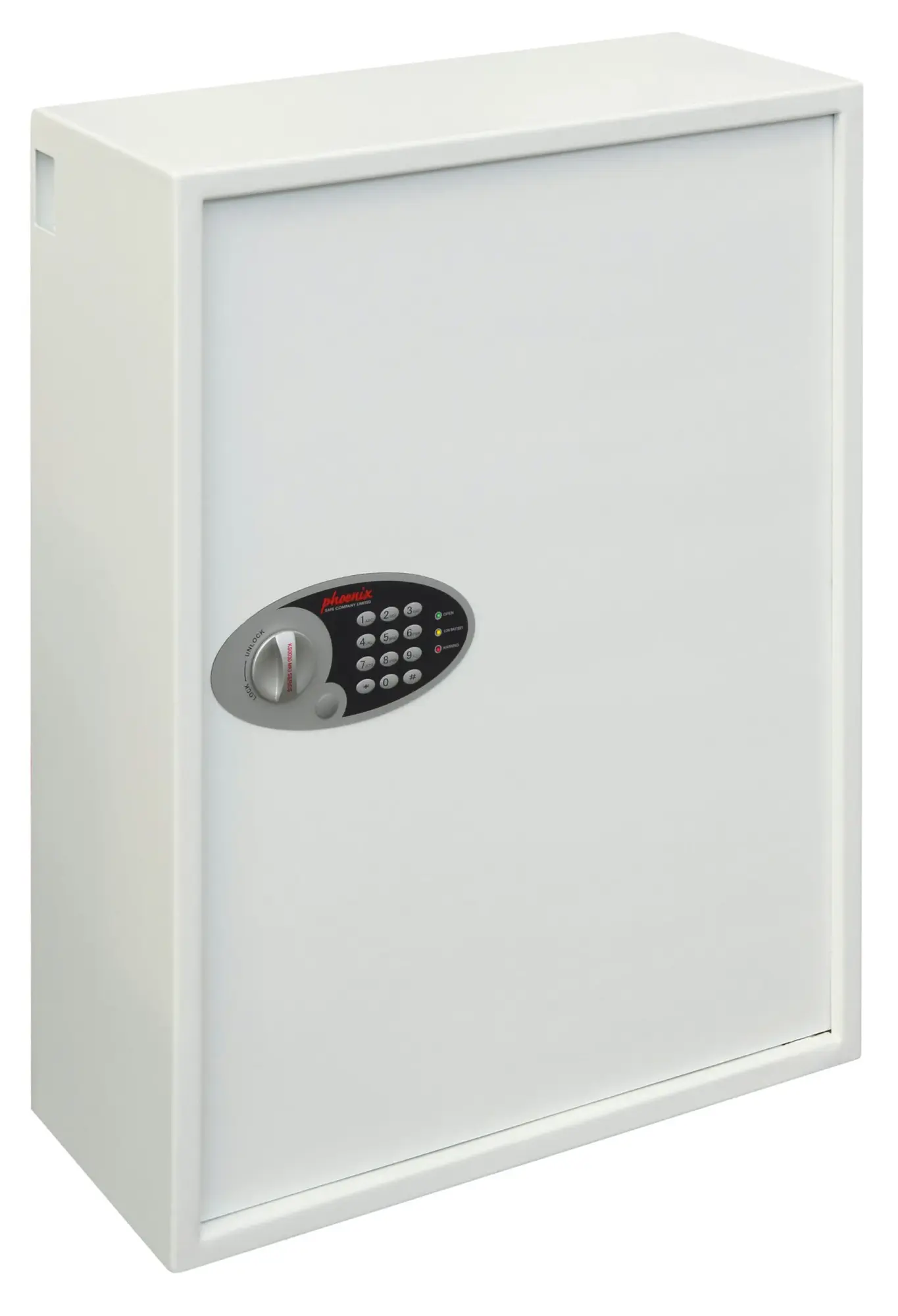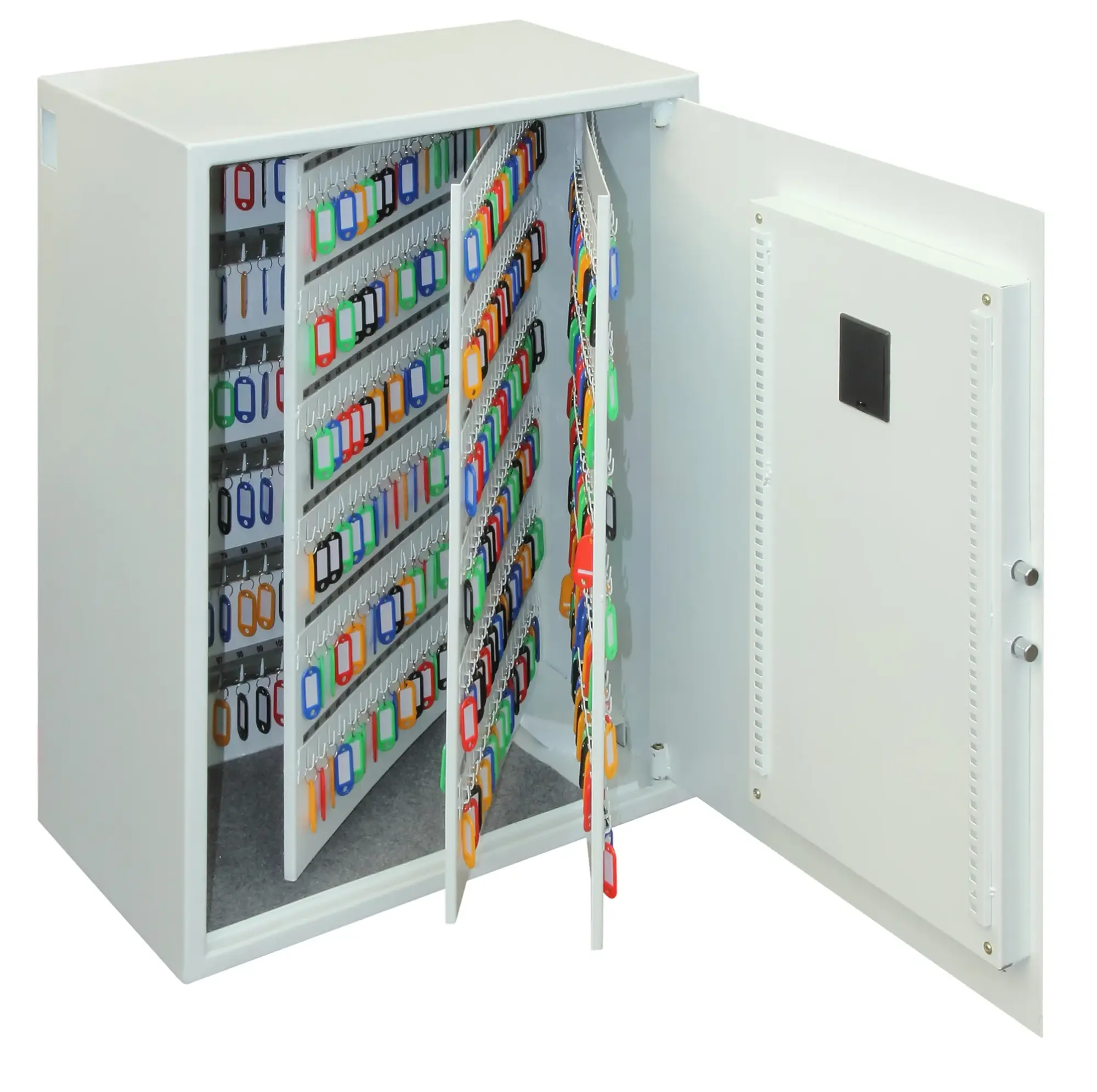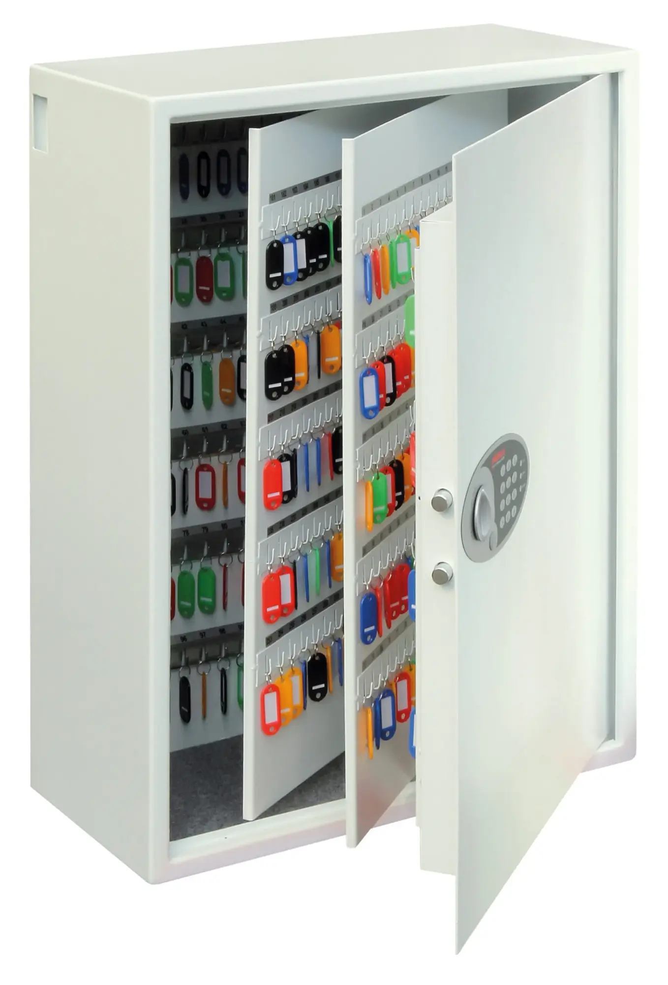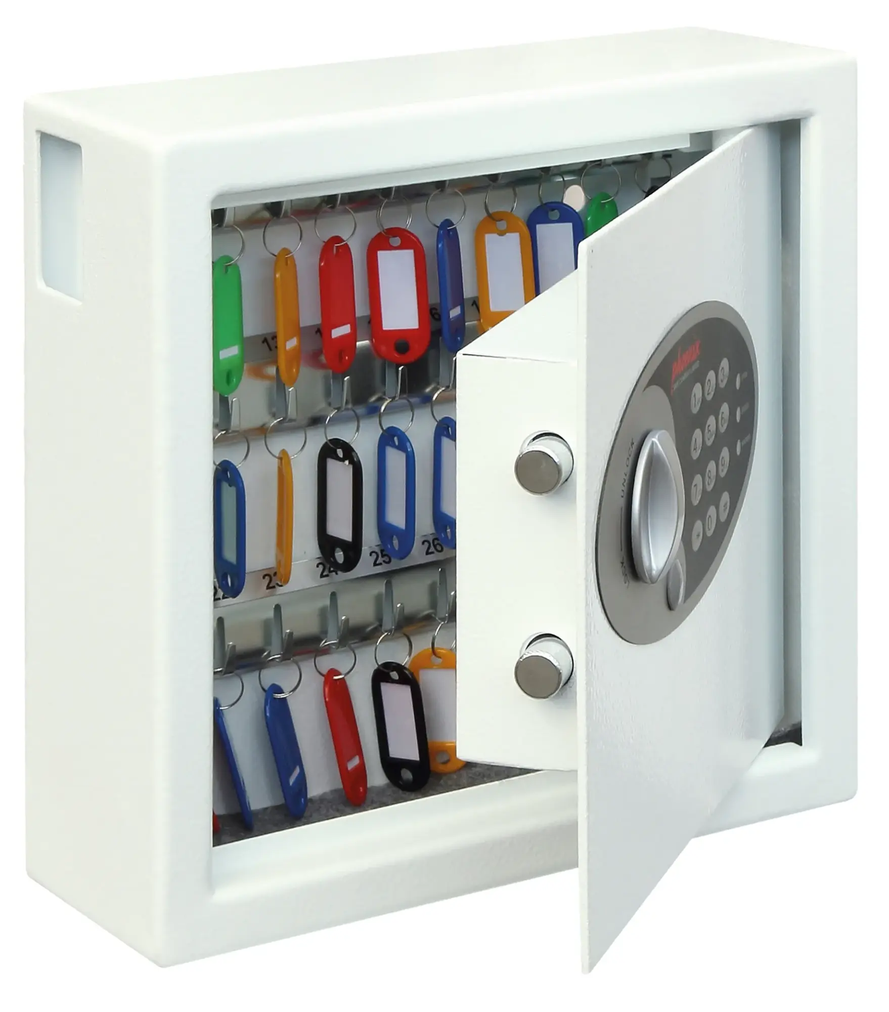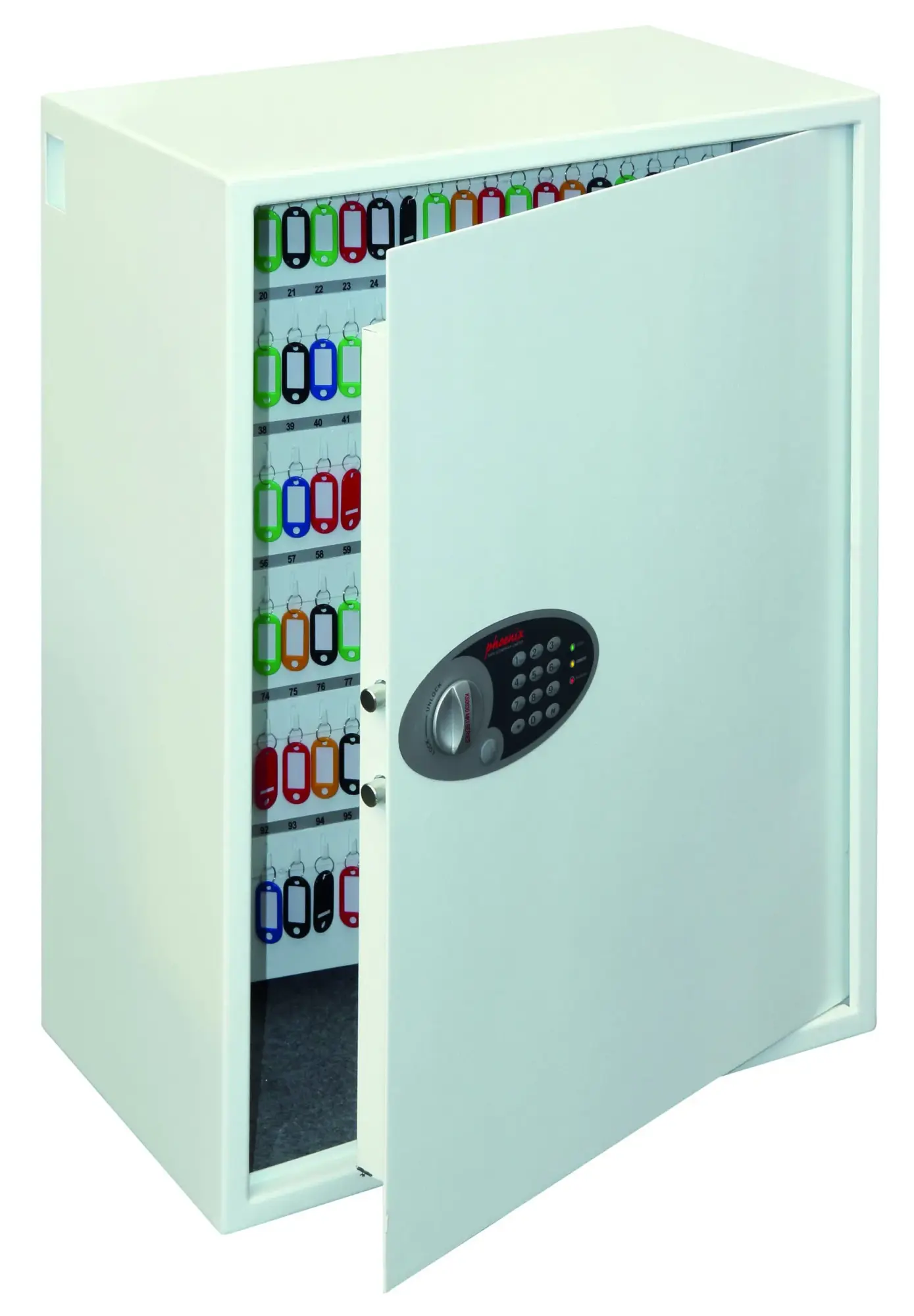 NO OF KEY HOOKS – 30, 48, 144, 300, 500 or 700 | LOCKING – Fitted with an advanced ‘user friendly’ electronic locking with anti-tamper or bounce solenoid locking System. For added peace of mind these safes are fitted with a key override facility should the code be misplaced (2 Keys supplied). | SECURITY – When bolted to a wall these key Safes provide defence against burglaries aimed at stealing car keys, house keys, office keys etc | FIXING – Ready prepared for fixing to the wall with bolts supplied | SPECIAL FEATURES – A unique key deposit slot allows keys to be deposited without the need to open the safe | DEPOSIT SLOT – 55H x 35W x 15Dmm | KEY TAGS – Supplied complete with a selection of coloured key rings | COLOUR – Finished in a high quality scratch resistant paint RAL9003 White.
