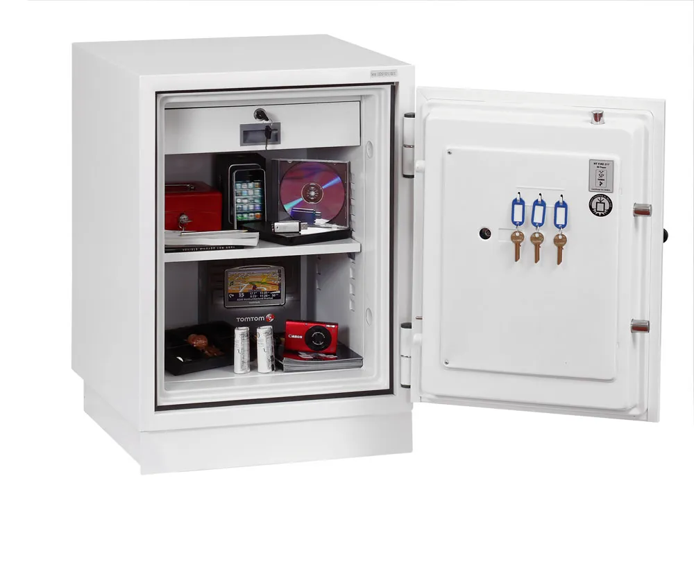 FIRE PROTECTION (PAPER) – Tested to Swedish NT Fire 017 – 90 Paper (Size 1 or 2) or 120 Paper (Size 3), providing up to 90 or 120 minutes fire protection respectively for paper documents | FIRE PROTECTION (DIGITAL MEDIA) – Tested to MTC – DIP120 – 60DM fire test standard, providing 60 minutes fire protection for digital media, DVD’s, USB memory stick and hard drives | SECURITY PROTECTION – The safe is recommended for an overnight cash risk of £2,500.00 or £25,000.00 valuables | DROP TEST – Fire and impact tested from 9.1 metres for resistance to the impact of falling through the burning floors of a building | FITTINGS – Each safe comes complete with height adjustable shelf and lockable cash/valuables drawer | FIXING – Ready prepared for floor fixing with fixing bolts for concrete supplied | SPECIAL FEATURES – Fitted with automatic slam shut door locking | COLOUR – Finished in a high quality scratch resistant paint RAL9003 White