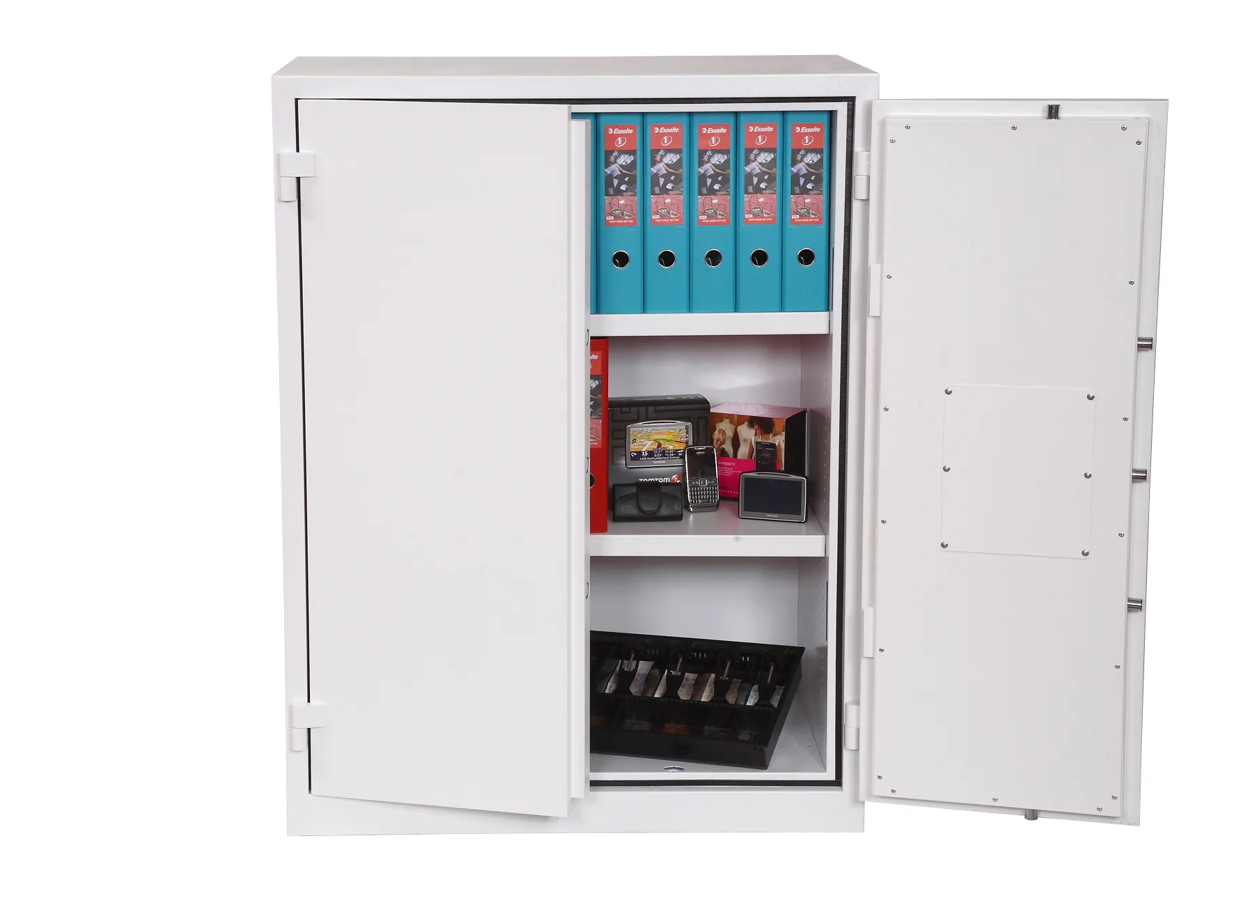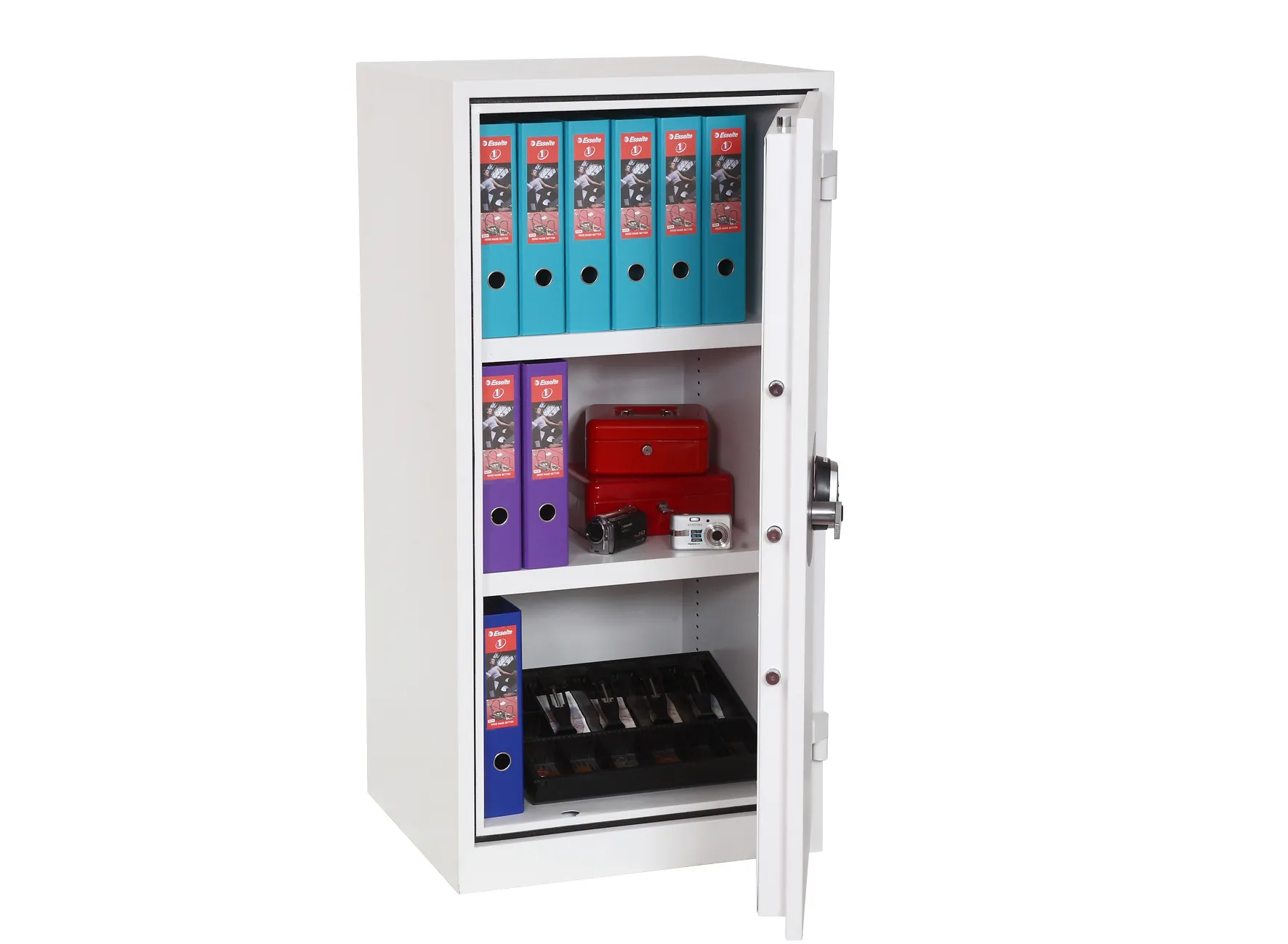FIRE PROTECTION – Provides 30 minutes fire protection for paper records at 500 °C | SECURITY PROTECTION – The safe is recommended for overnight cash cover of £1,500 or valuables cover of £15,000 | CONSTRUCTION – High security 3 way espagnolette boltwork provides great strength and attack resistance | SPECIAL FEATURES – Supplied with 2 height adjustable shelves that also includes hanging rails for lateral files as standard | COLOUR – Finished in a high quality scratch resistant White paint RAL9003