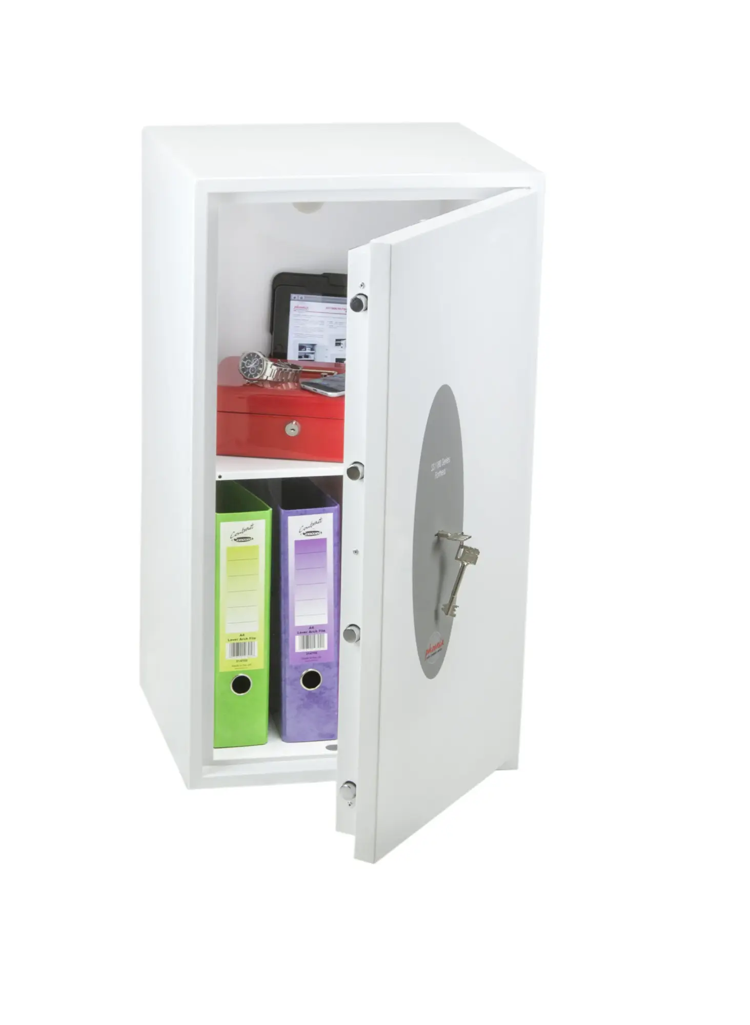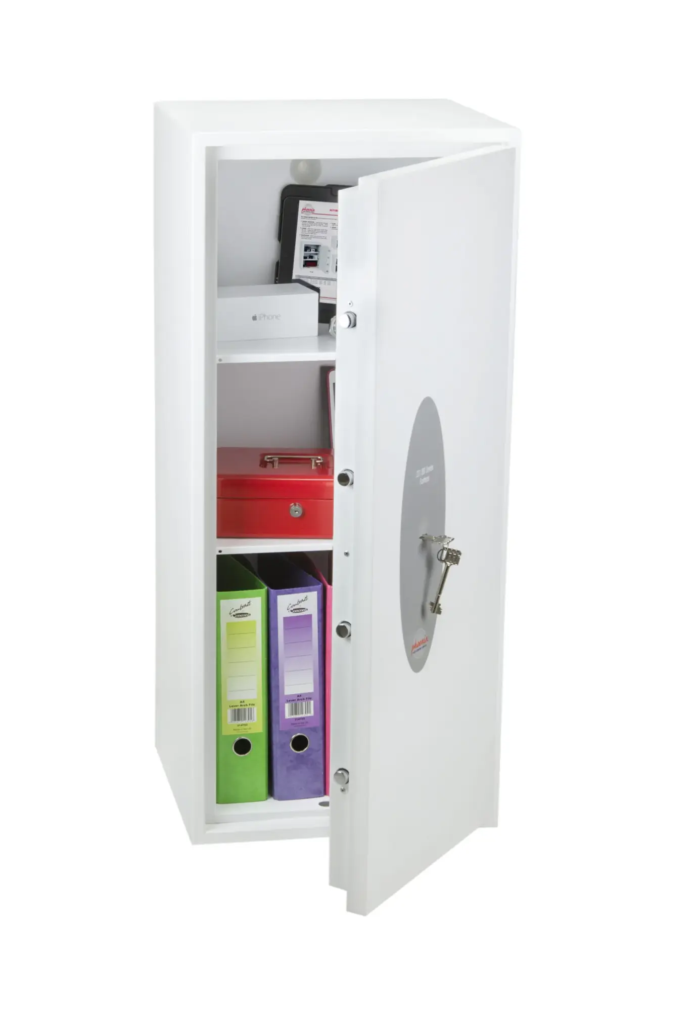 SECURITY PROTECTION – Tested to the prestigious European S2 Security standard (EN14450 – ECB.S Certified) giving cash cover of £4,000 or Valuables cover of £40,000 | APPROVALS – UK Police approved (Secured by Design scheme) and the Association of Insurance Surveyors (AiS) | CONSTRUCTION – Double wall construction with anti drill plates and re-locker protection for the door provide a safe of great strength | FIXING – Ready prepared for floor fixing, with fixing bolts for concrete supplied | COLOUR – Finished in a high quality scratch resistant White paint RAL9003 | Suitable for storage of controlled drugs whose active ingredients do not exceed 500 grams
