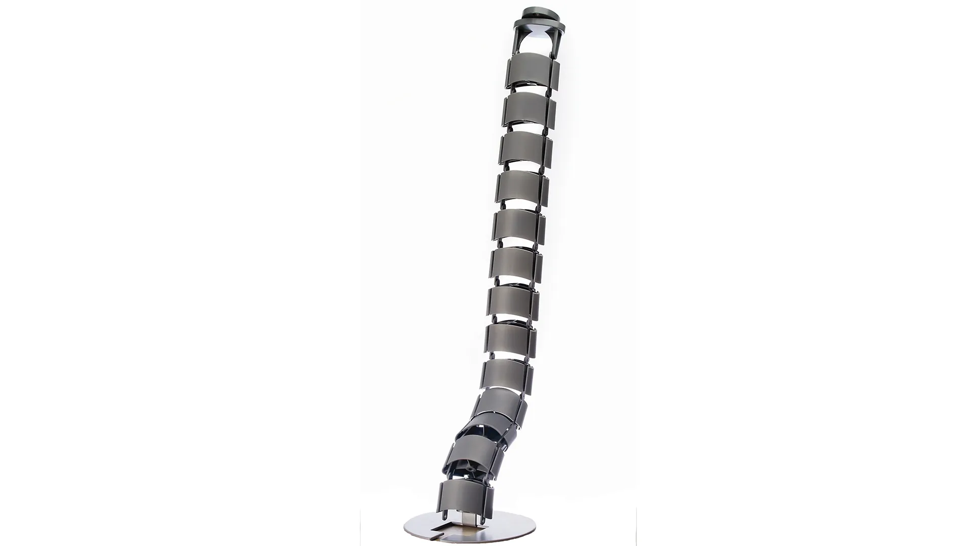 Plastic umbilical style cable management spine | Accomodates multiples cables | Easy fixes to underside of desk | Weighted shoe anchors to the floor | Cables will easily fold in and out.